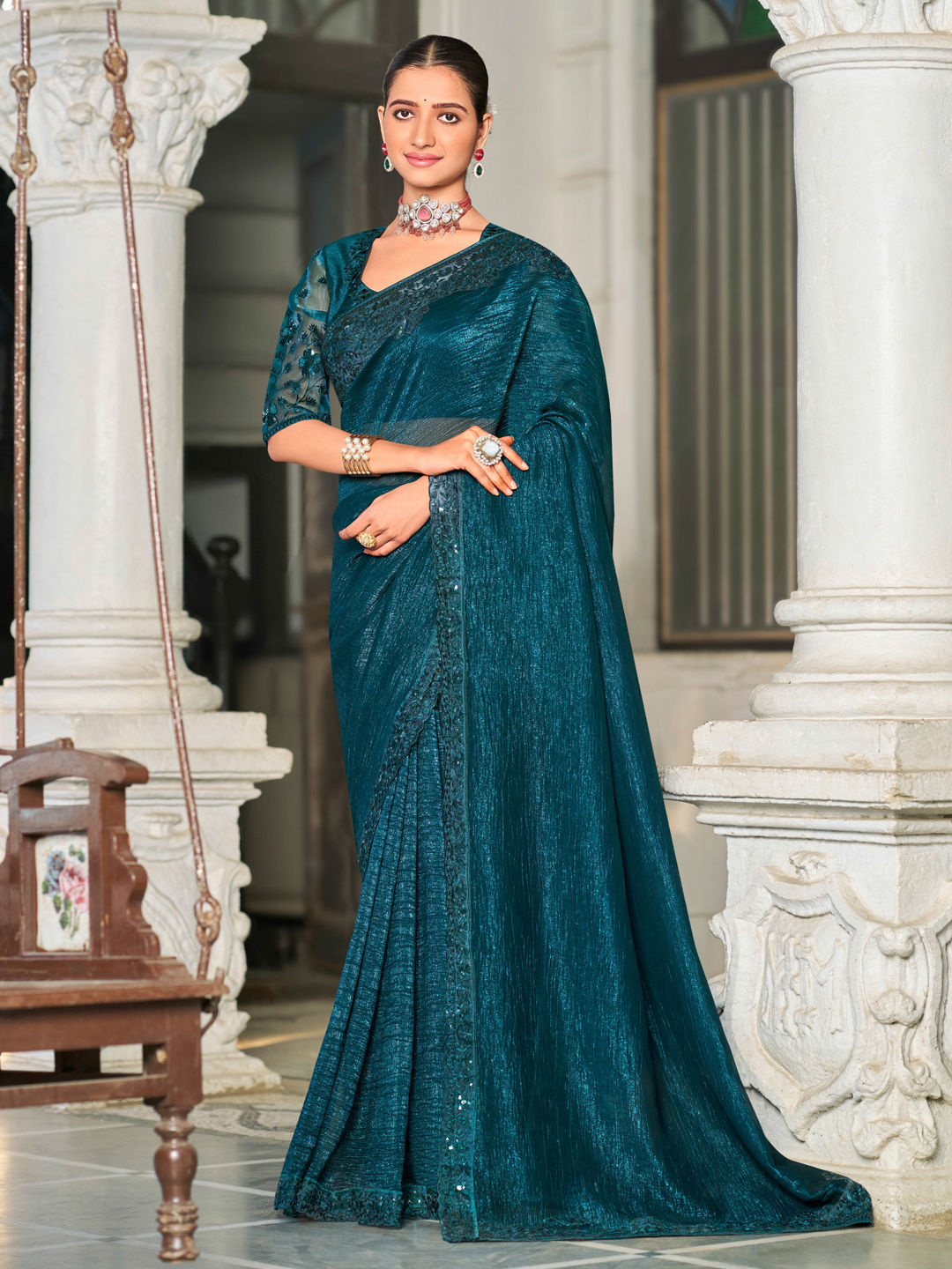 Blue color Saree in Crushed Silk fabric with Embroidered, Sequence, Thread work