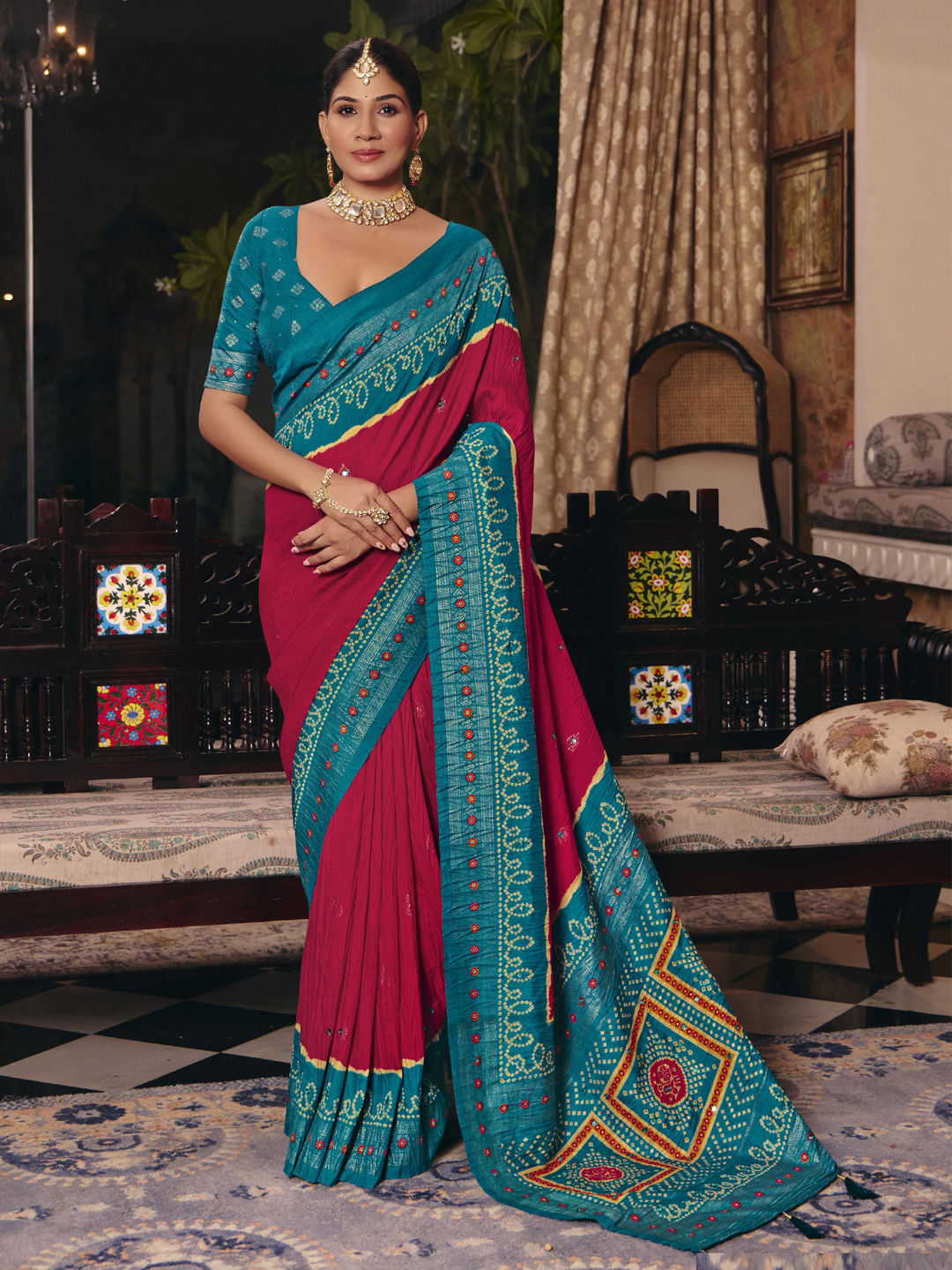 Crushed Silk Festive Saree in Pink and Majenta with Bandhej work