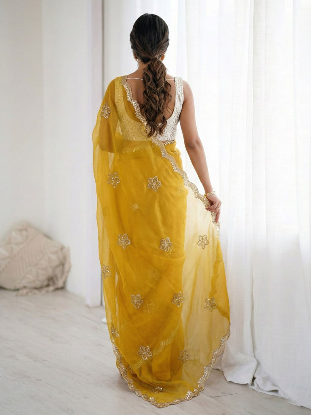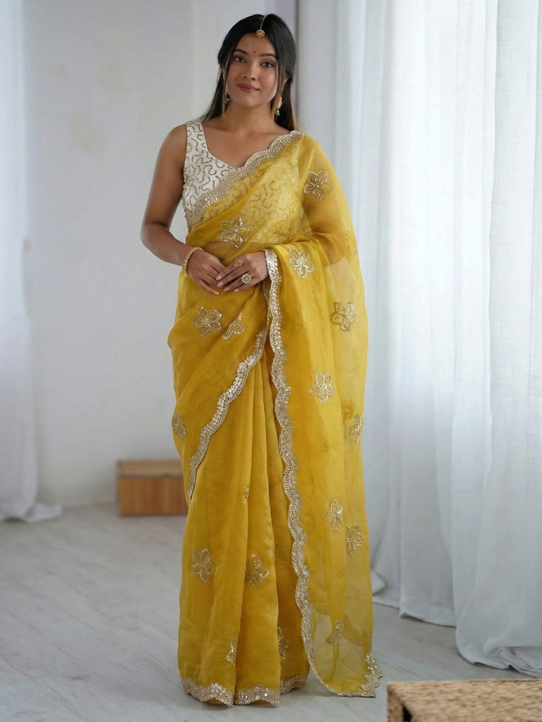 Yellow color Saree in Crushed Silk fabric with Embroidered, Thread work