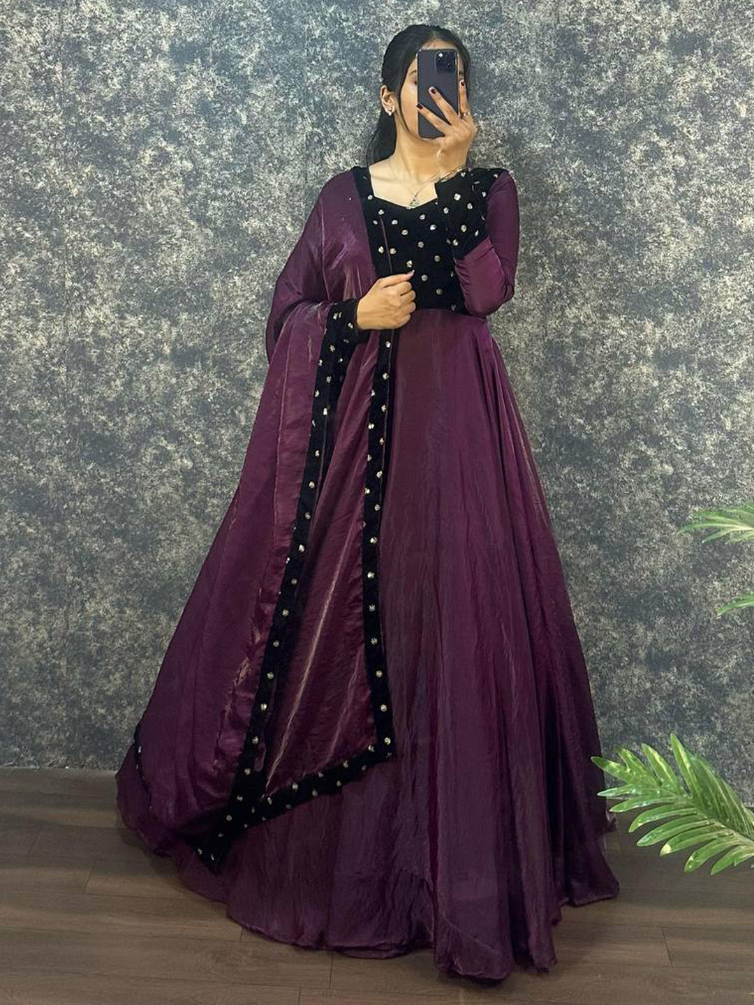 Pink and Majenta color Gown in Crushed Silk, Velvet fabric with Sequence work