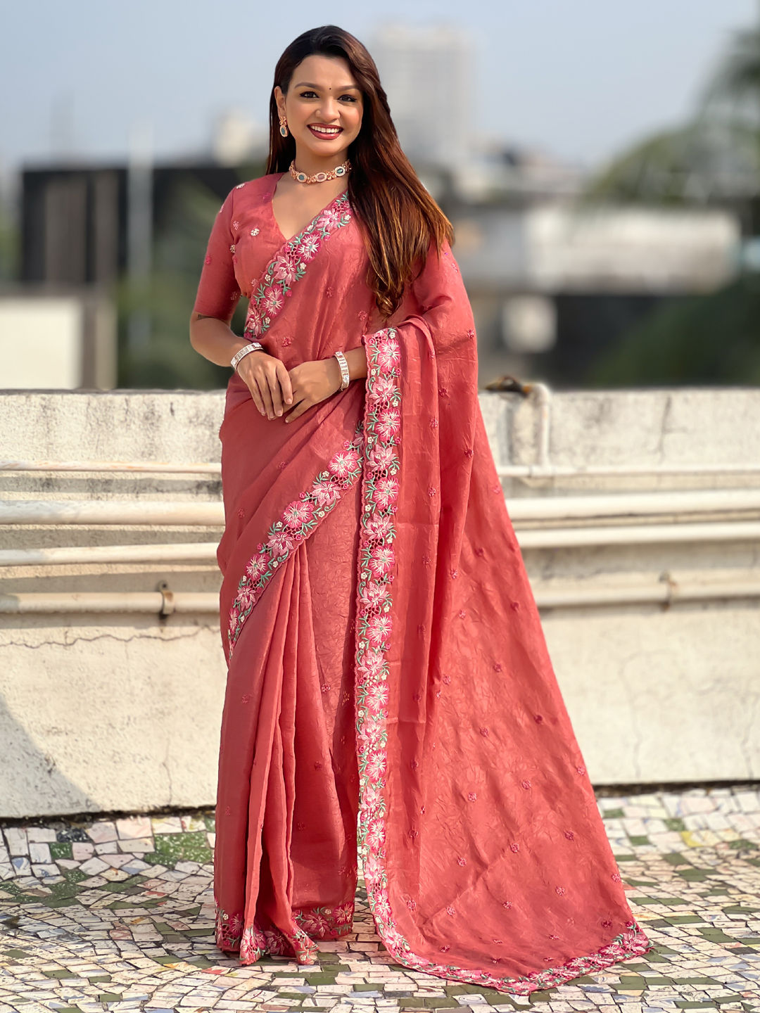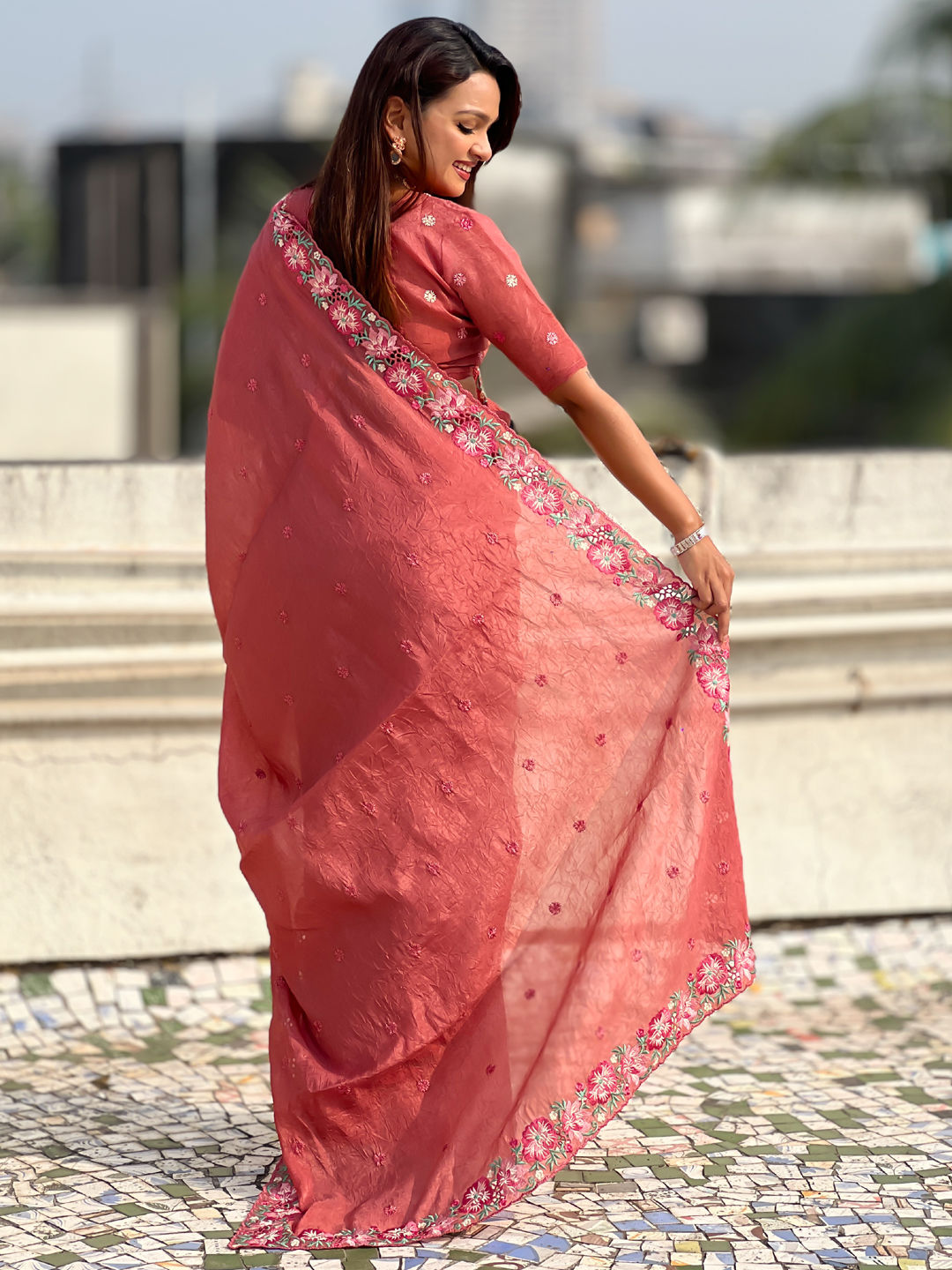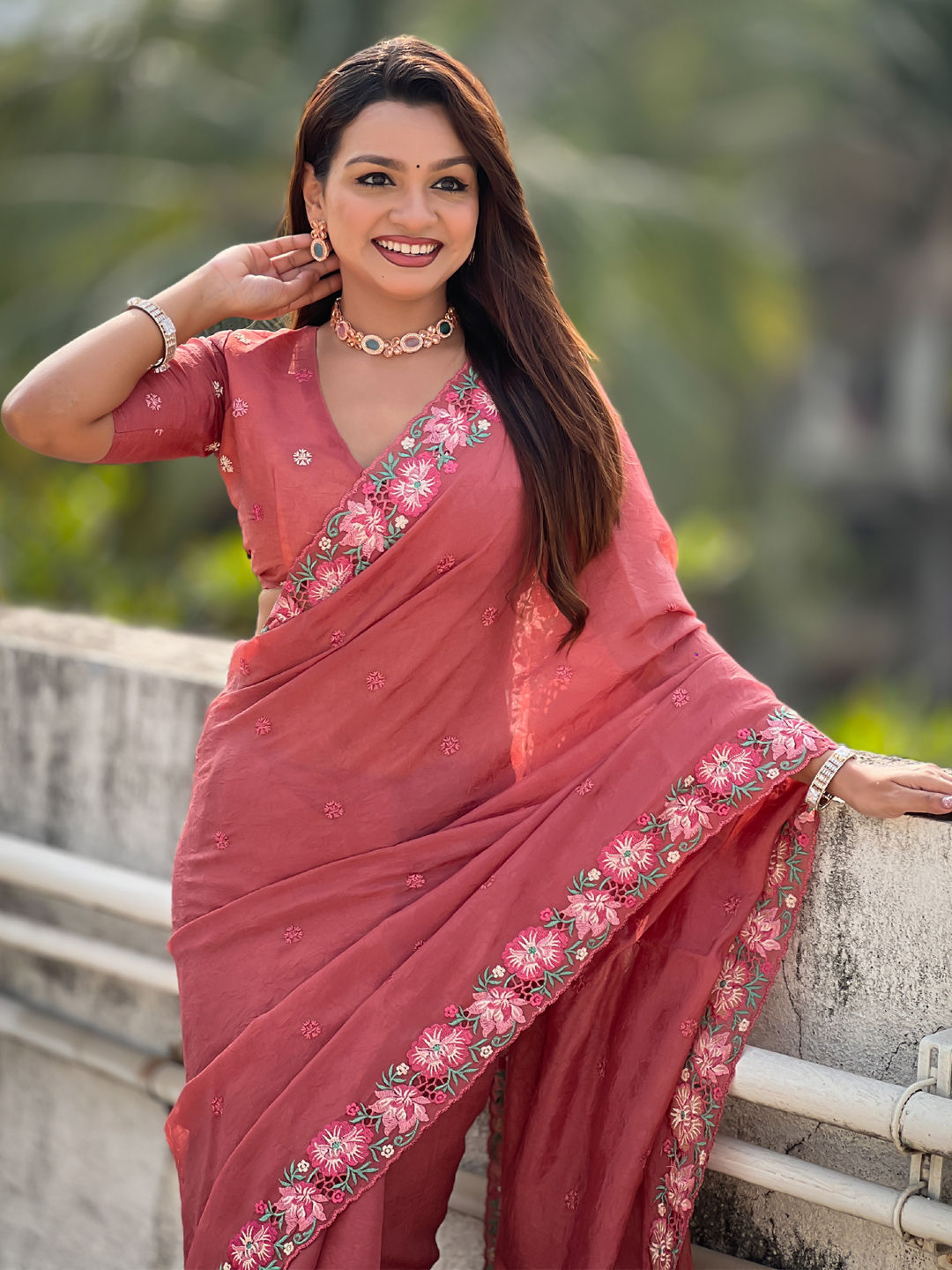 Pink and Majenta color Saree in Crushed Silk fabric with Embroidered, Thread work