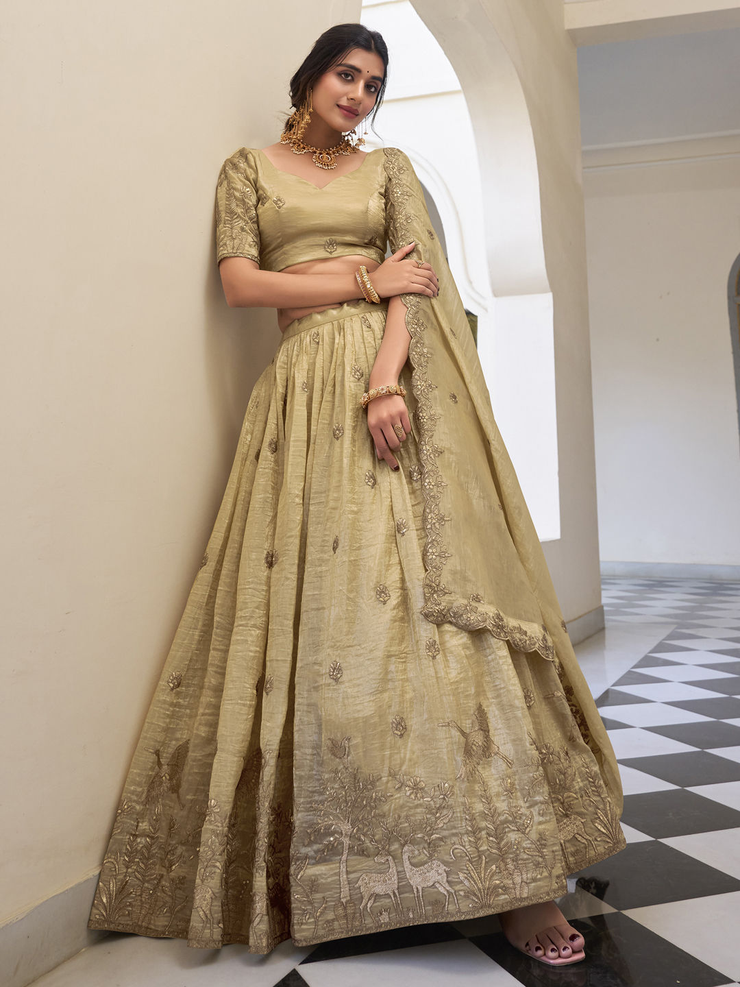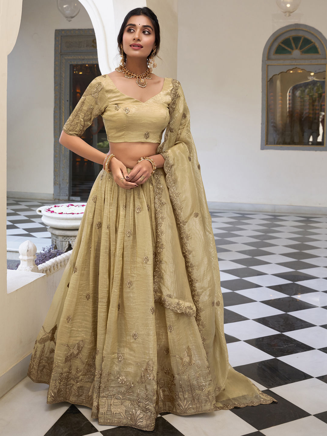 Beige and Brown color Lehenga in Crushed Silk fabric with Embroidered, Resham, Thread work