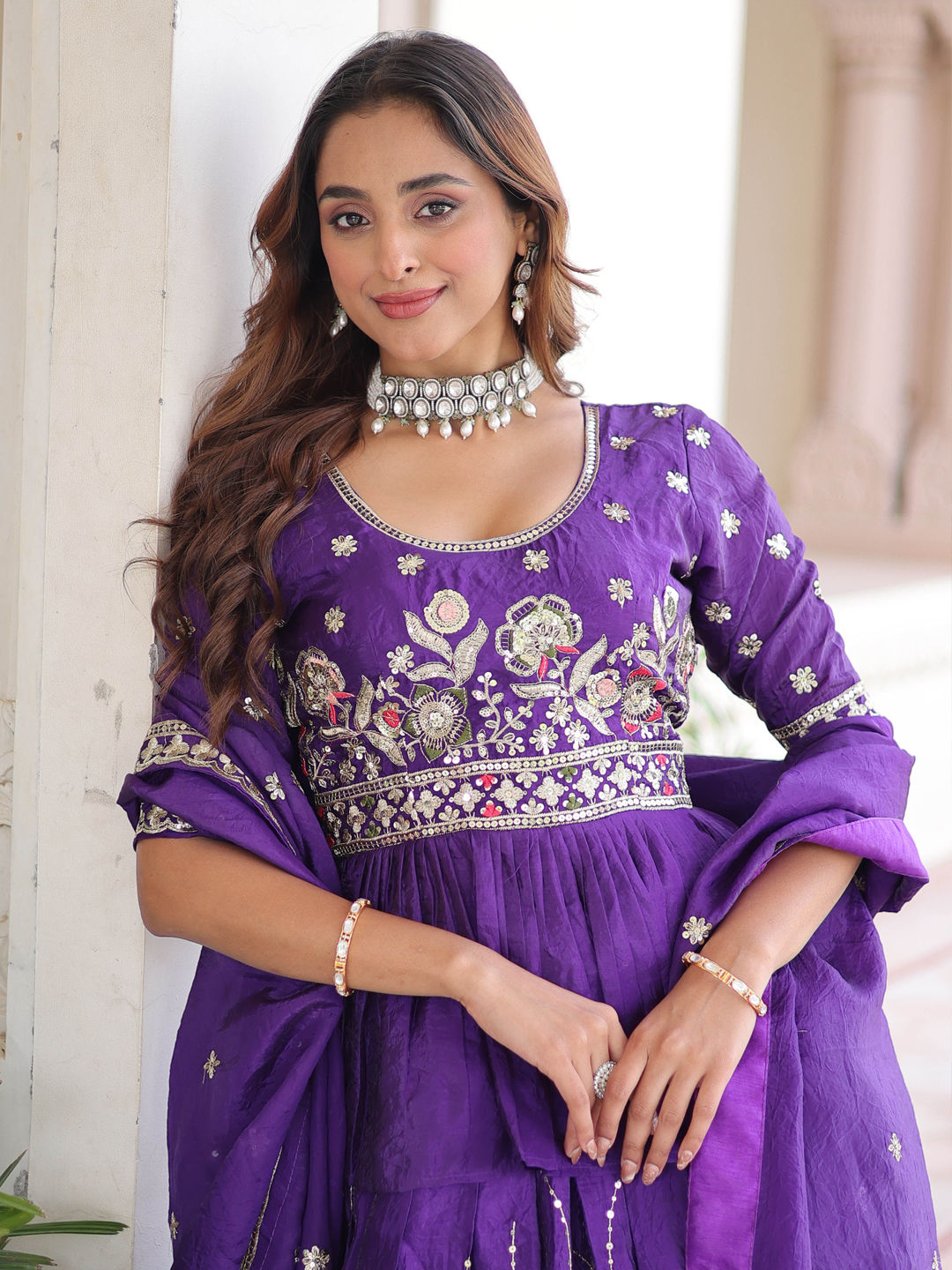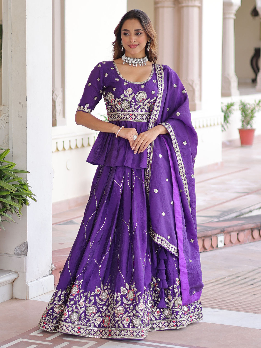 Purple and Violet color Long Lehenga Choli in Crushed Silk fabric with Embroidered, Sequence, Thread, Zari work