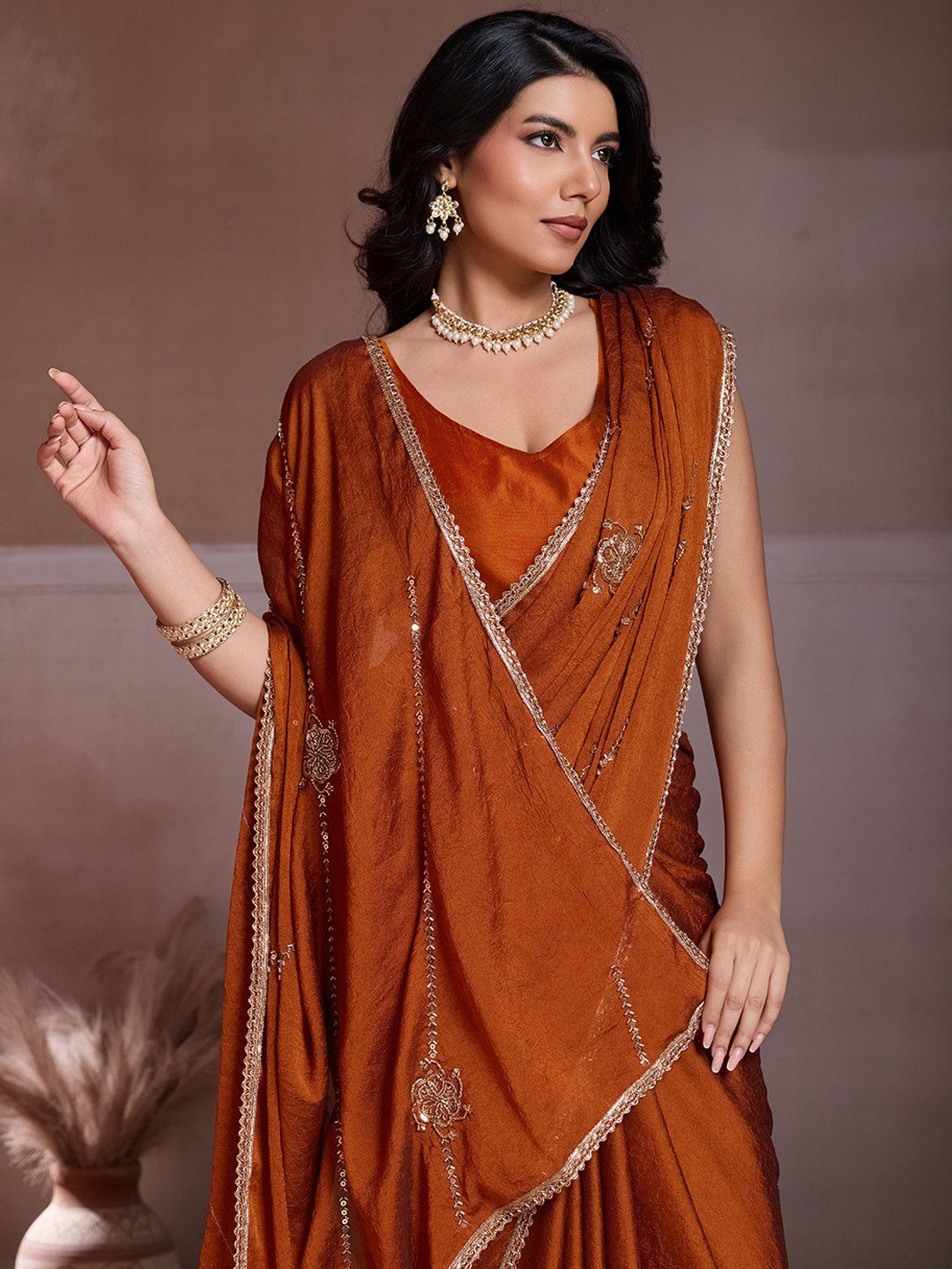 Beige and Brown color Saree in Crushed Silk fabric with Bugle Beads, Embroidered work