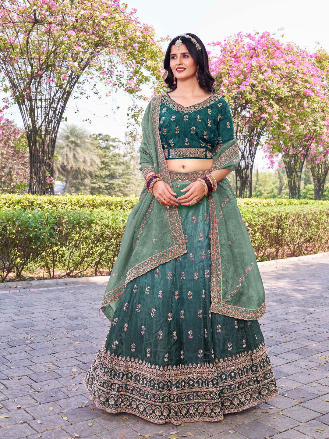 Crushed Silk Festive Lehenga in Green with Embroidered work