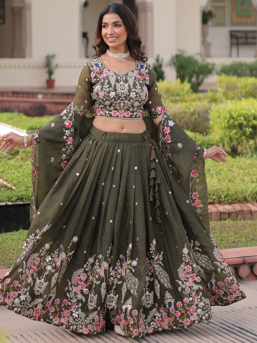 Green color Lehenga in Crushed Silk fabric with Embroidered, Resham, Sequence, Thread work