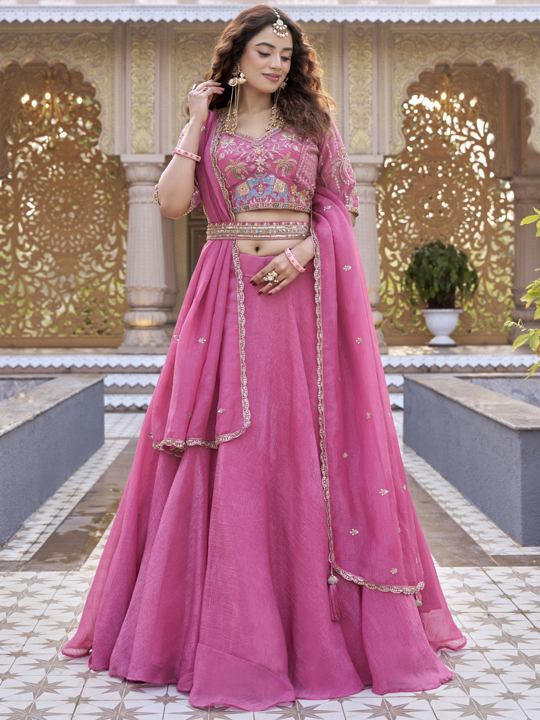 Pink and Majenta color Lehenga in Crushed Silk fabric with Embroidered work