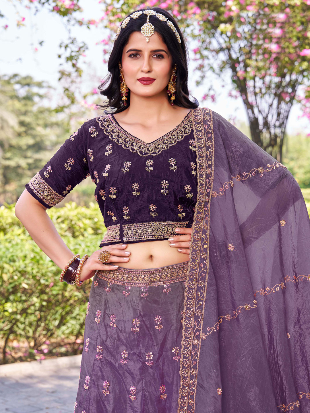 Purple and Violet color Lehenga in Crushed Silk fabric with Embroidered, Sequence, Thread work