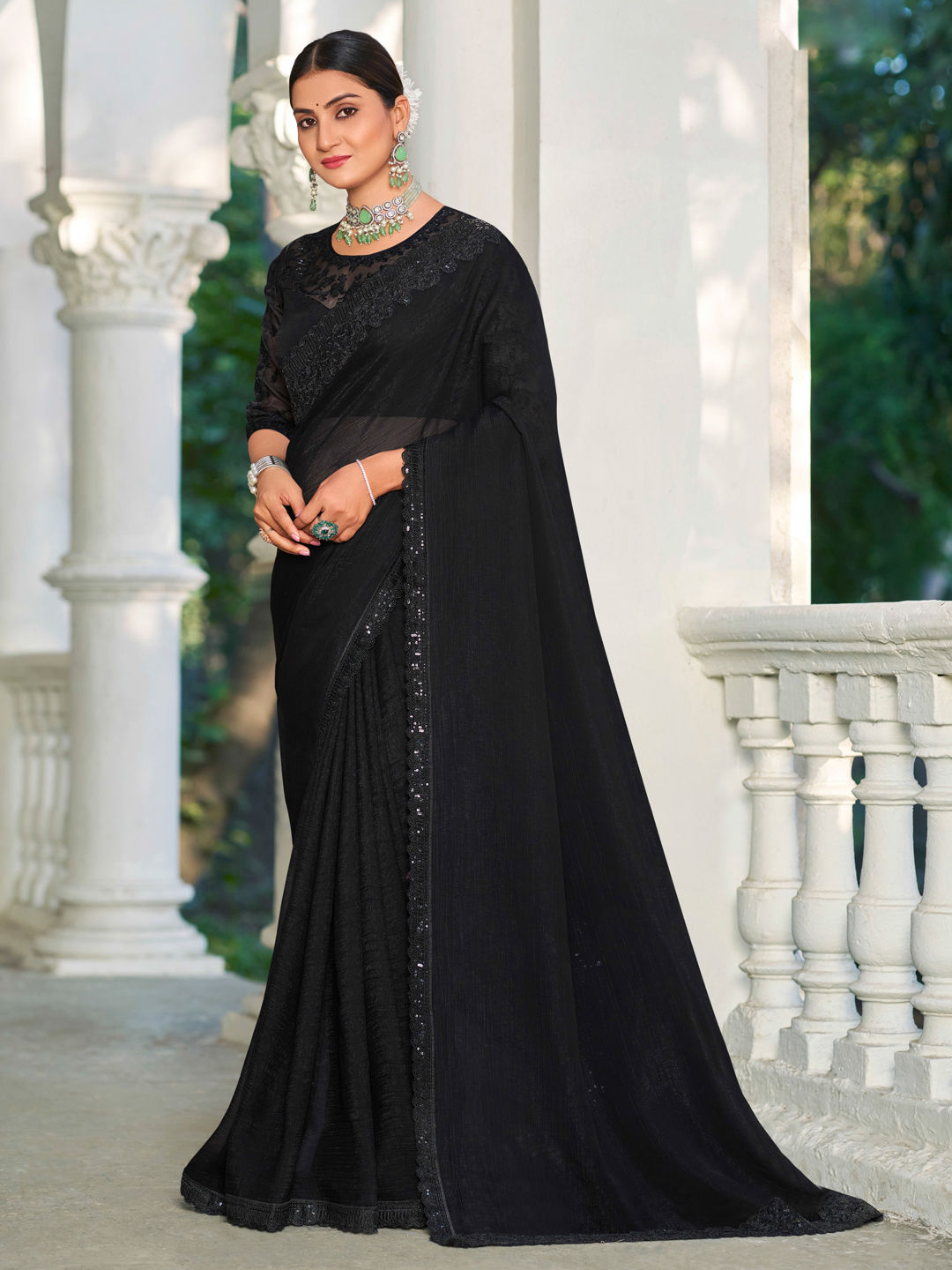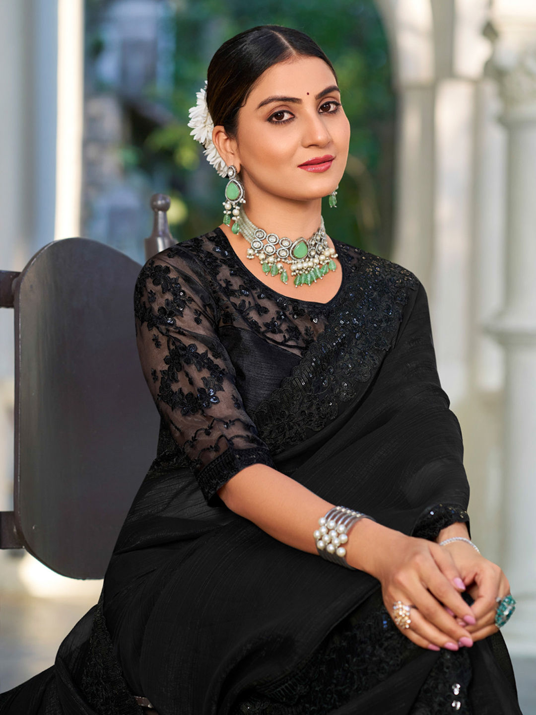 Black and Grey color Saree in Crushed Silk fabric with Embroidered, Sequence, Thread work