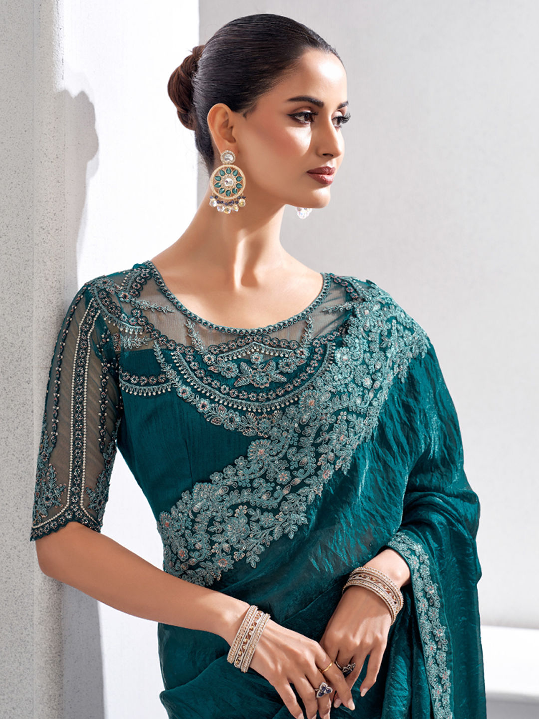 Blue color Saree in Crushed Silk fabric with Embroidered, Sequence work