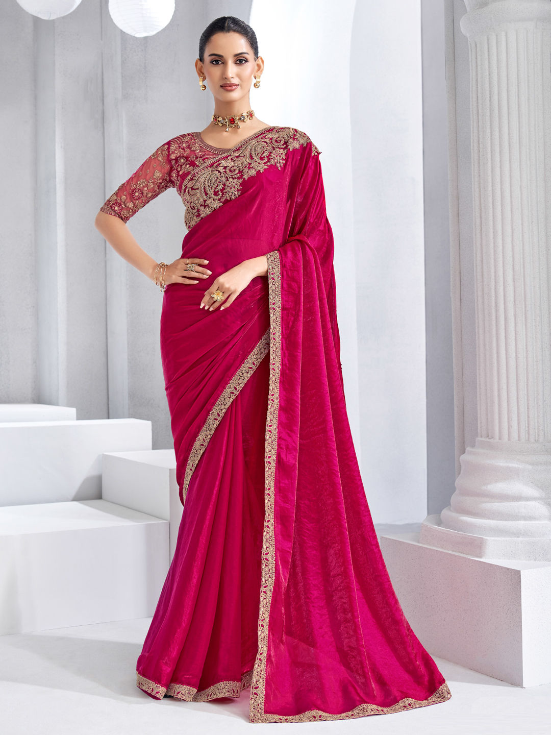 Crushed Silk Wedding Saree in Pink and Majenta with Sequence work