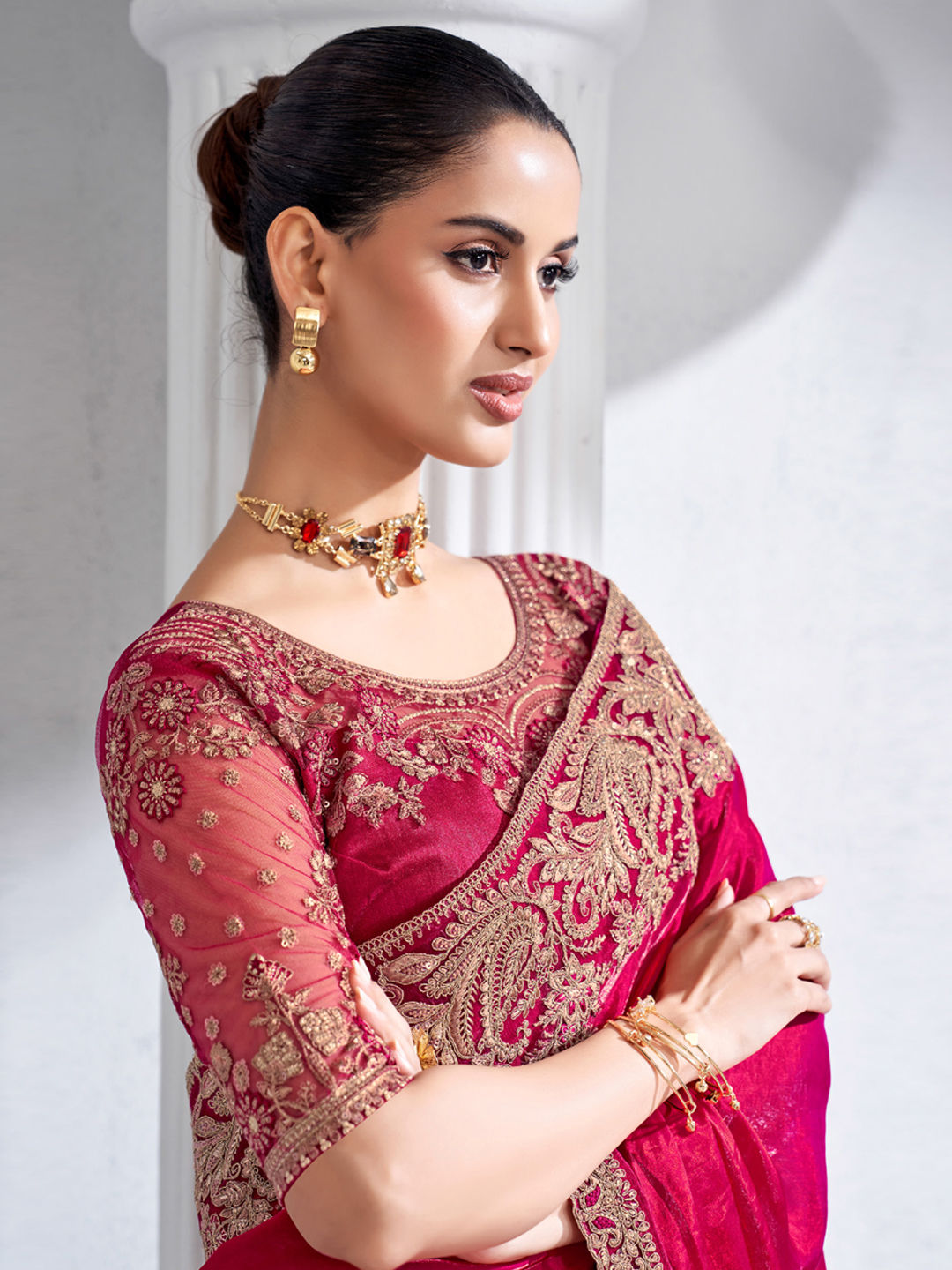 Crushed Silk Bridal Saree in Pink and Majenta with Embroidered work