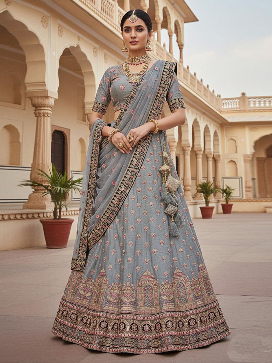 Black and Grey color Lehenga in Dupion Silk fabric with Embroidered, Swarovski, Thread work