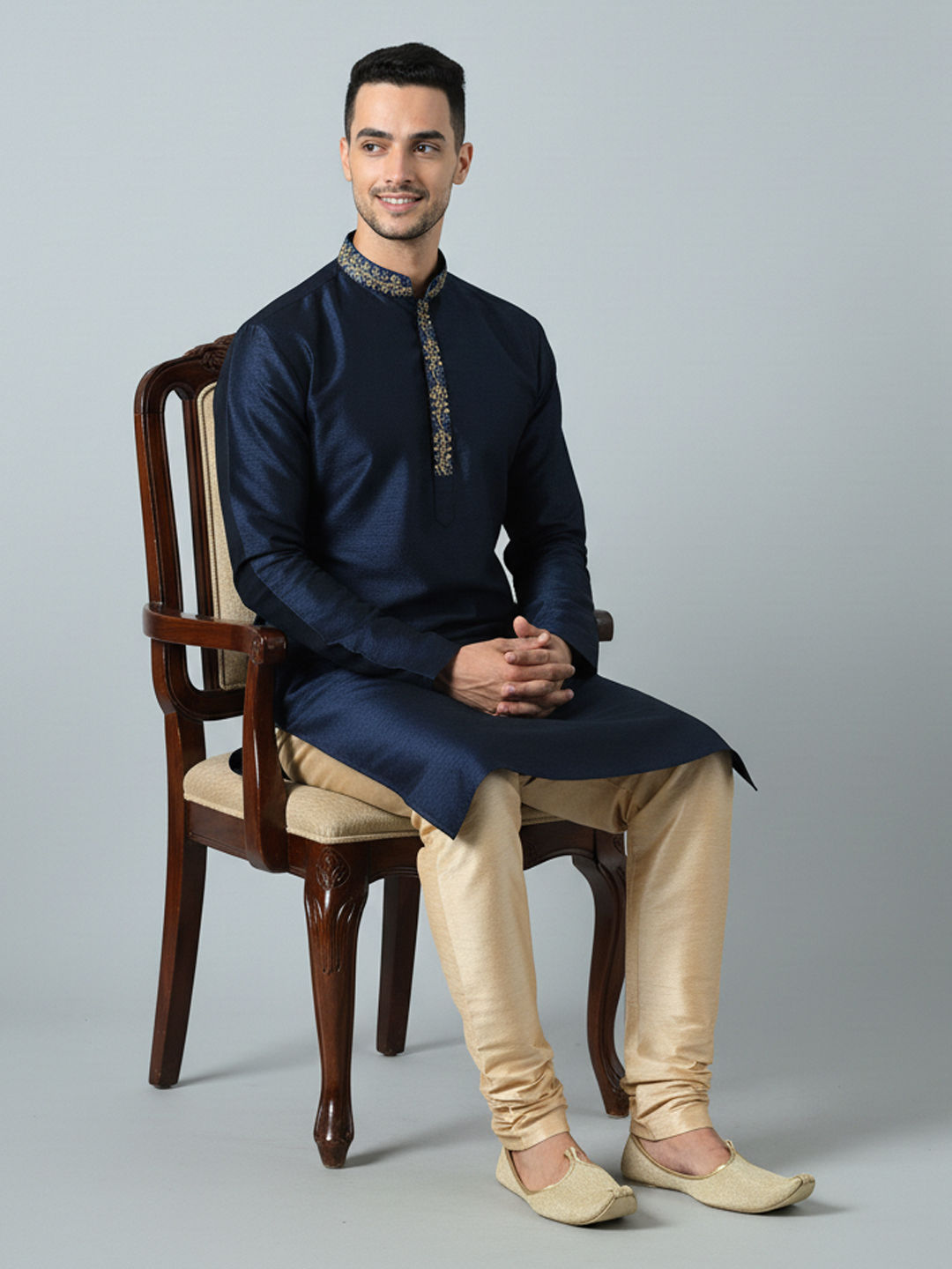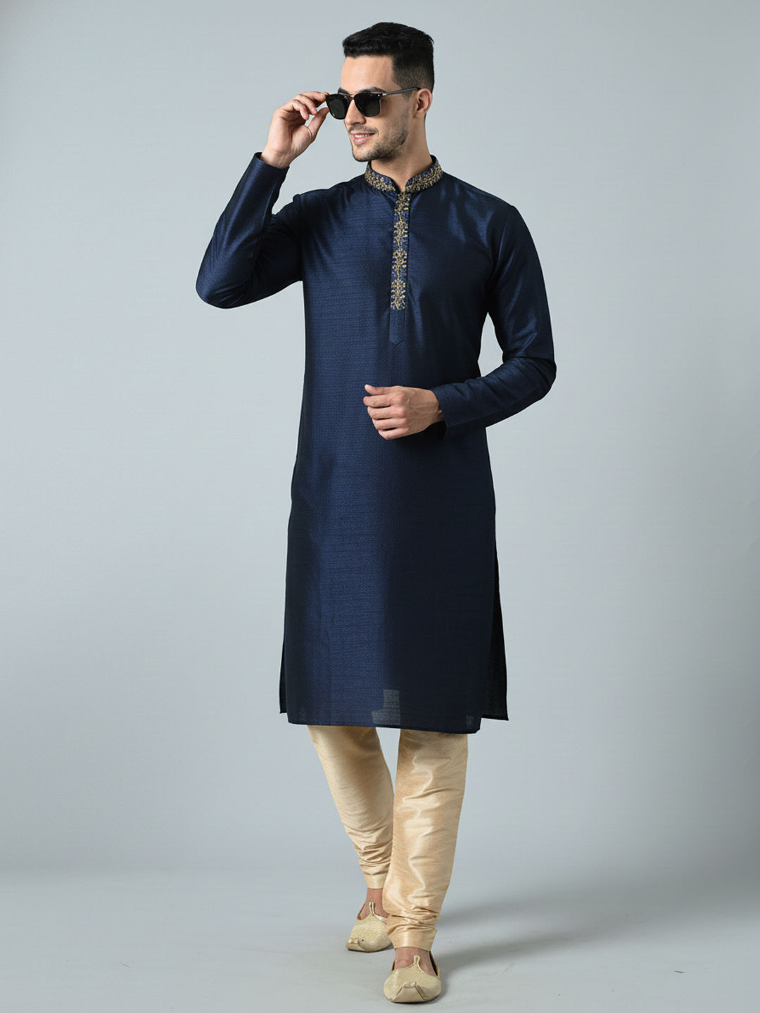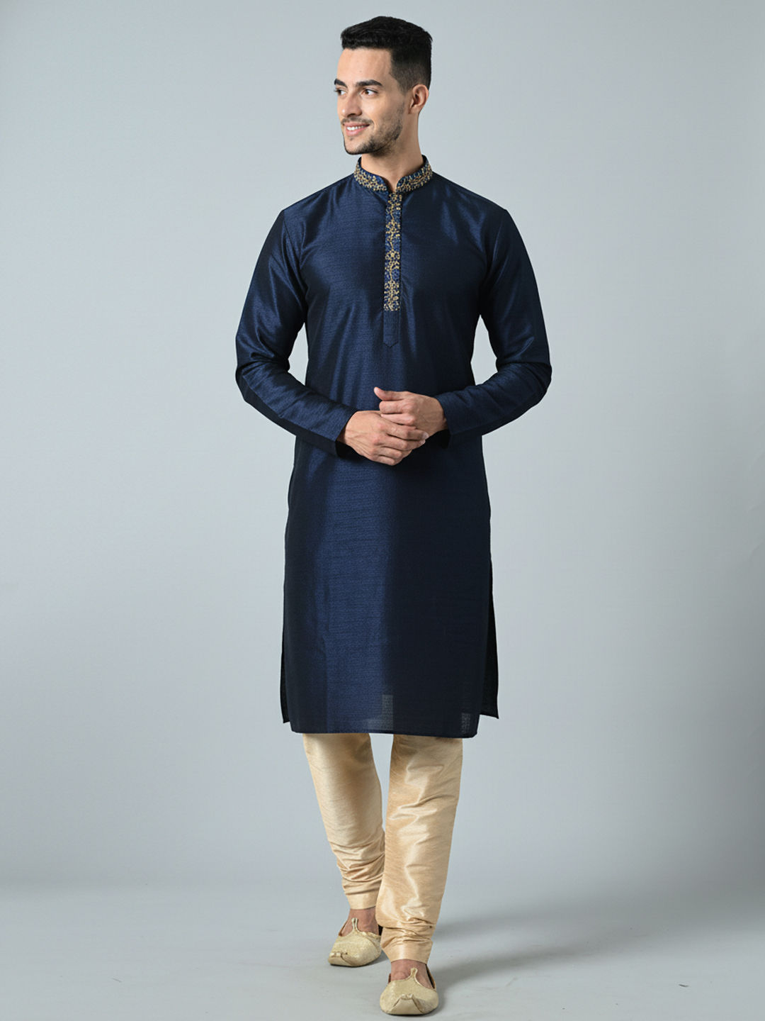 Dupion Silk Festive Kurta Pyjamas in Blue with Embroidered work