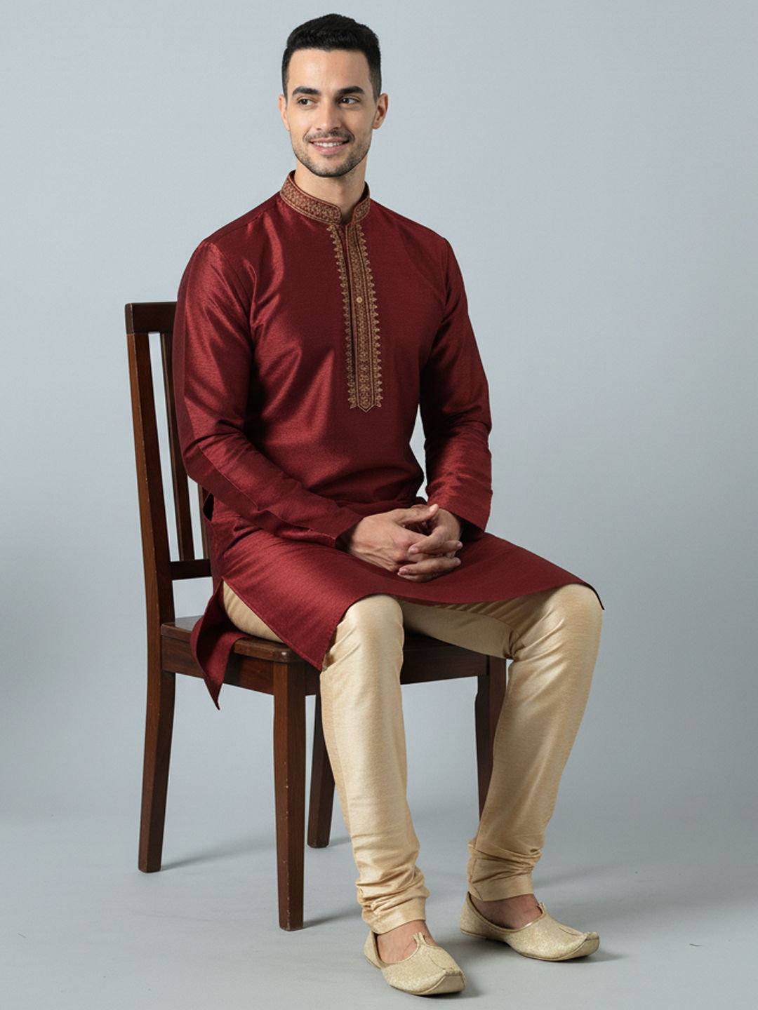 Dupion Silk Festive Kurta Pyjamas in Red and Maroon with Embroidered work