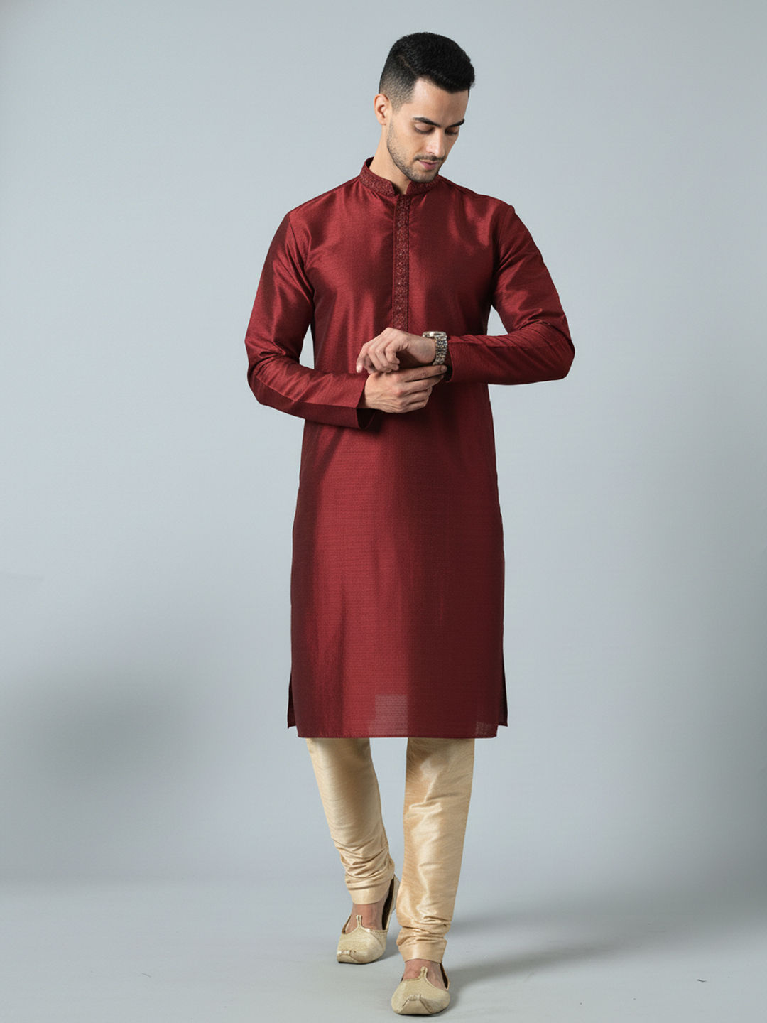 Dupion Silk Festive Kurta Pyjamas in Red and Maroon with Embroidered work