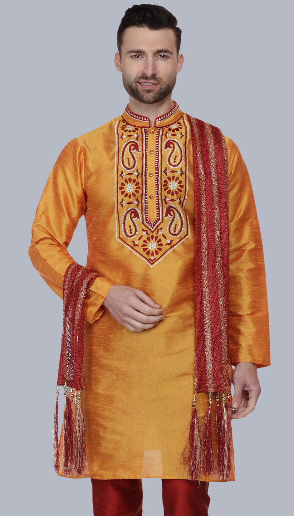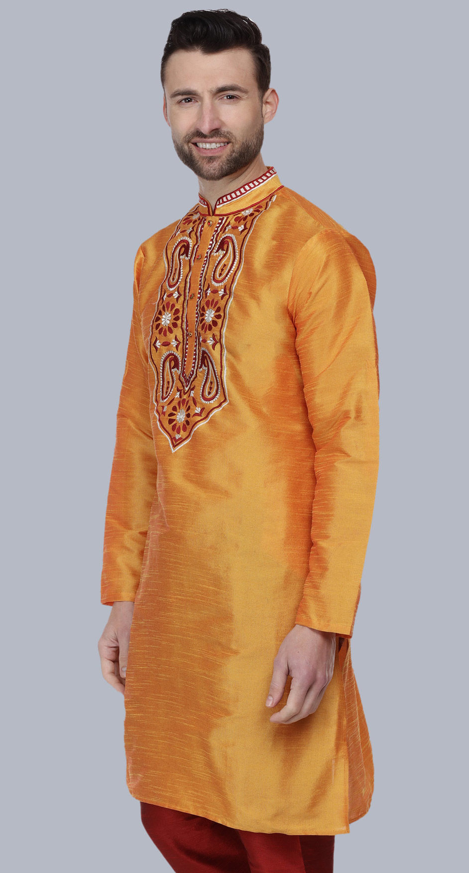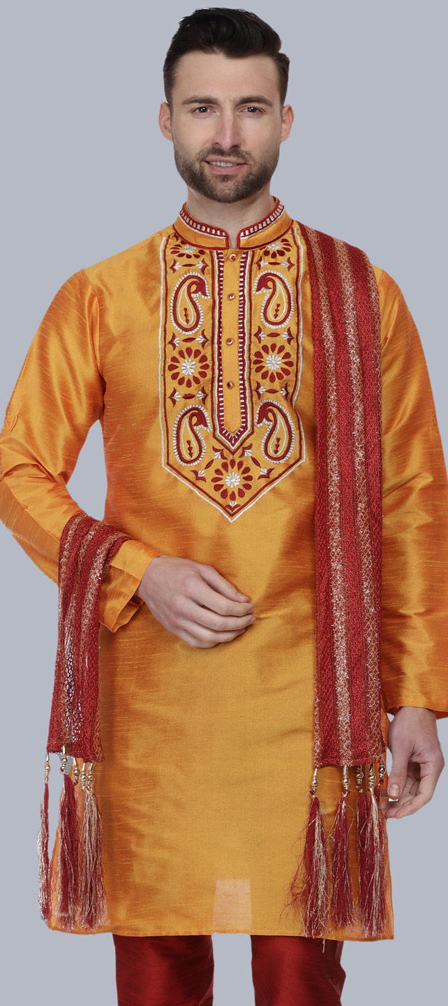 Orange color Kurta in Dupion Silk fabric with Embroidered work
