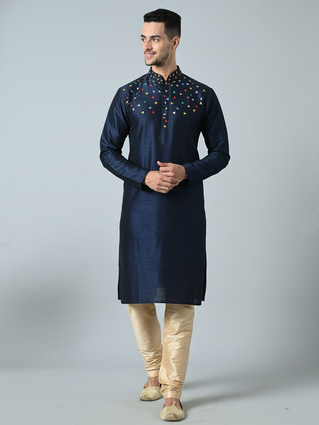 Dupion Silk Festive Kurta Pyjamas in Blue with Embroidered work