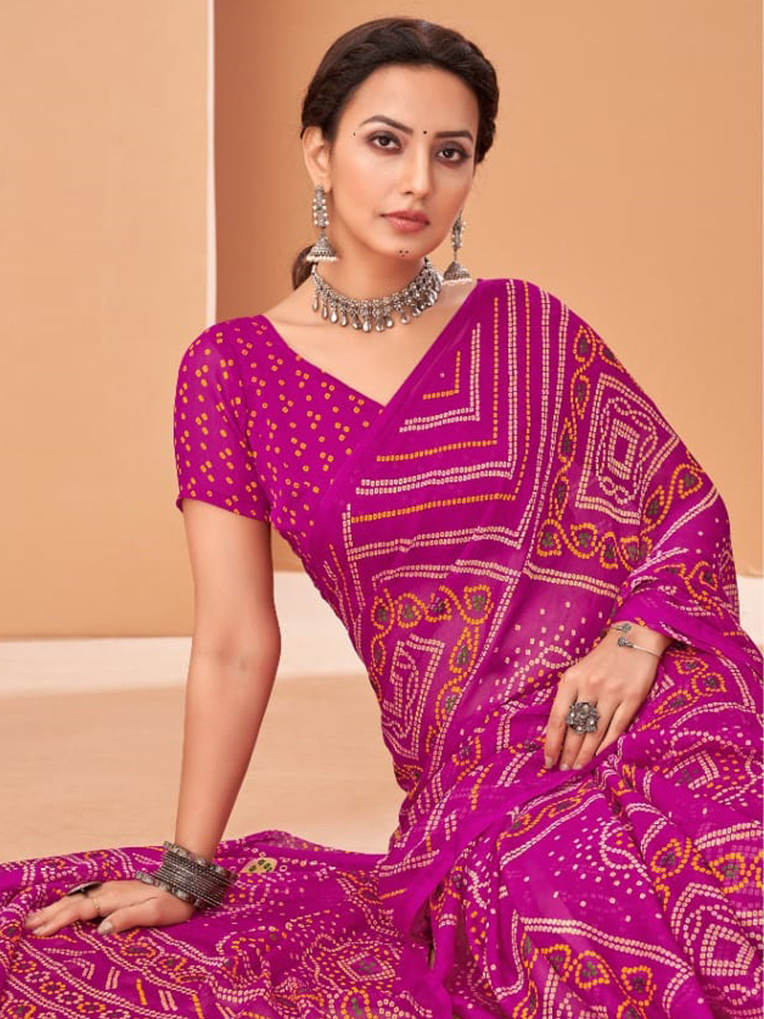 Pink and Majenta color Saree in Faux Chiffon fabric with Bandhej, Printed work