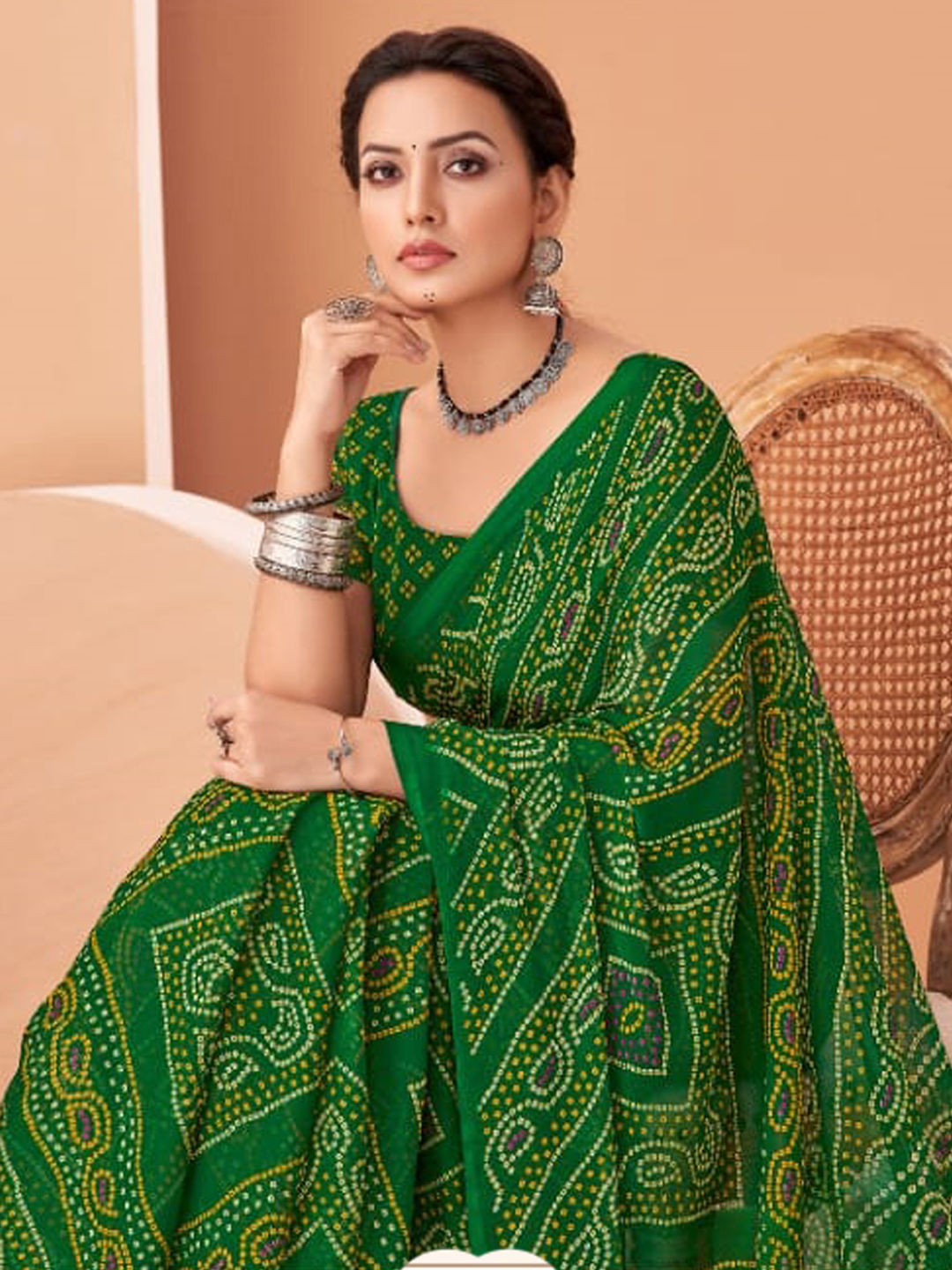 Green color Saree in Faux Chiffon fabric with Bandhej, Printed work
