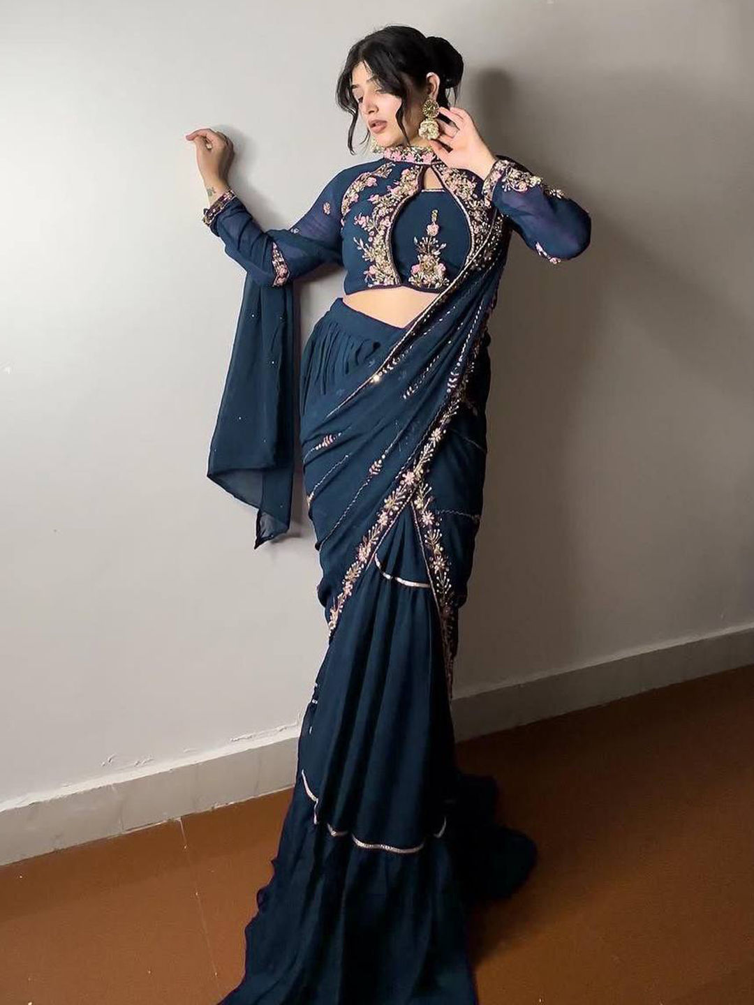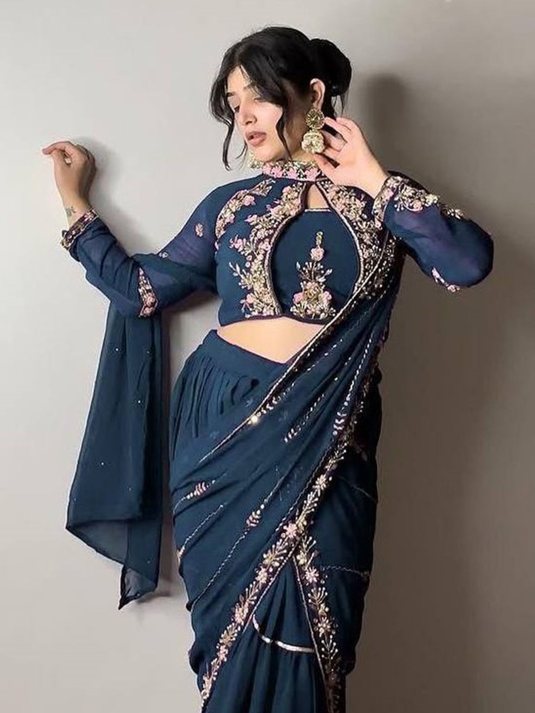 Blue color Ready to Wear Lehenga in Faux Georgette fabric with Embroidered, Mirror, Sequence, Thread work