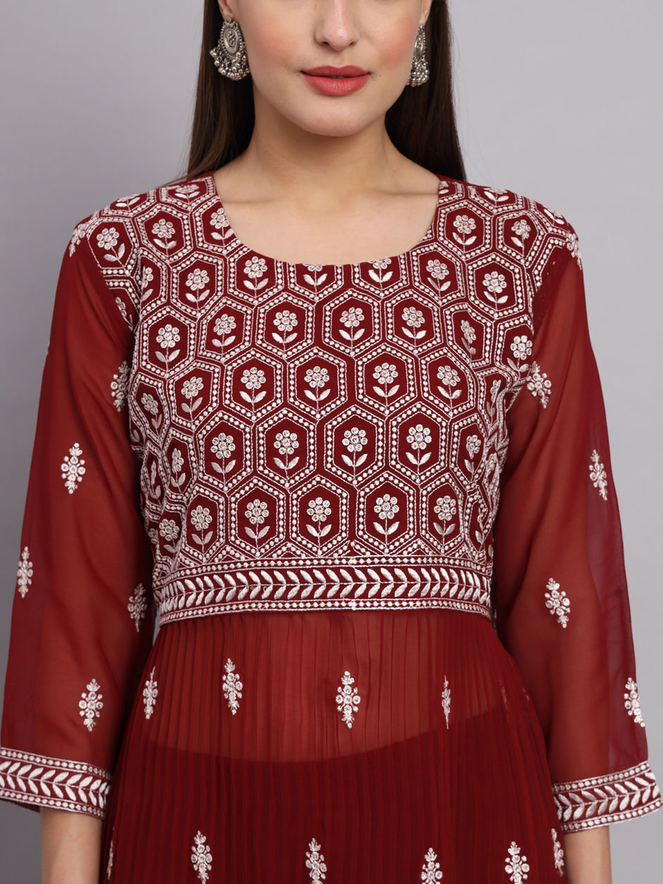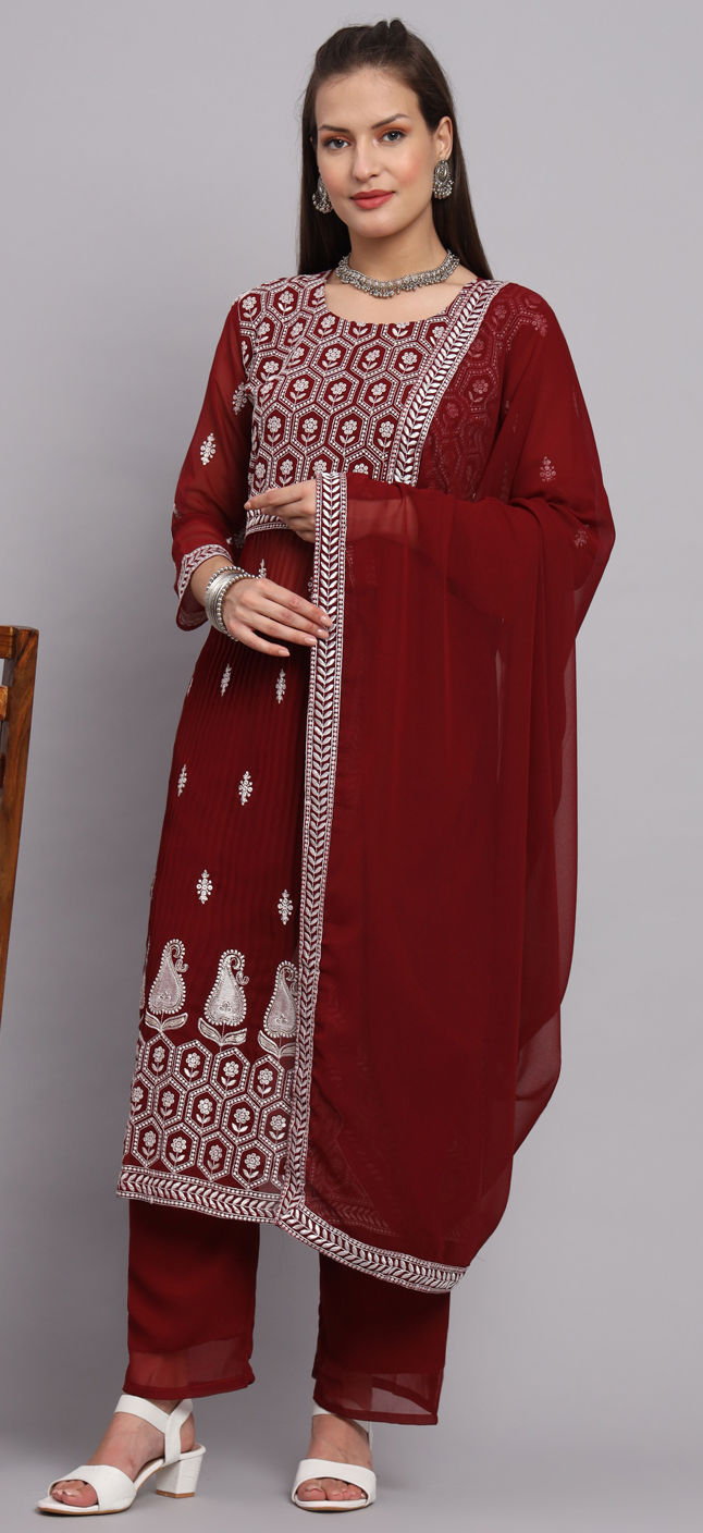 Red and Maroon color Salwar Kameez in Faux Georgette fabric with Embroidered, Resham, Sequence, Thread work