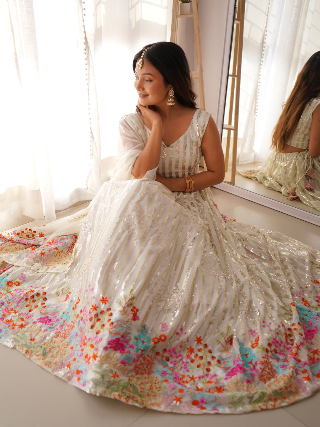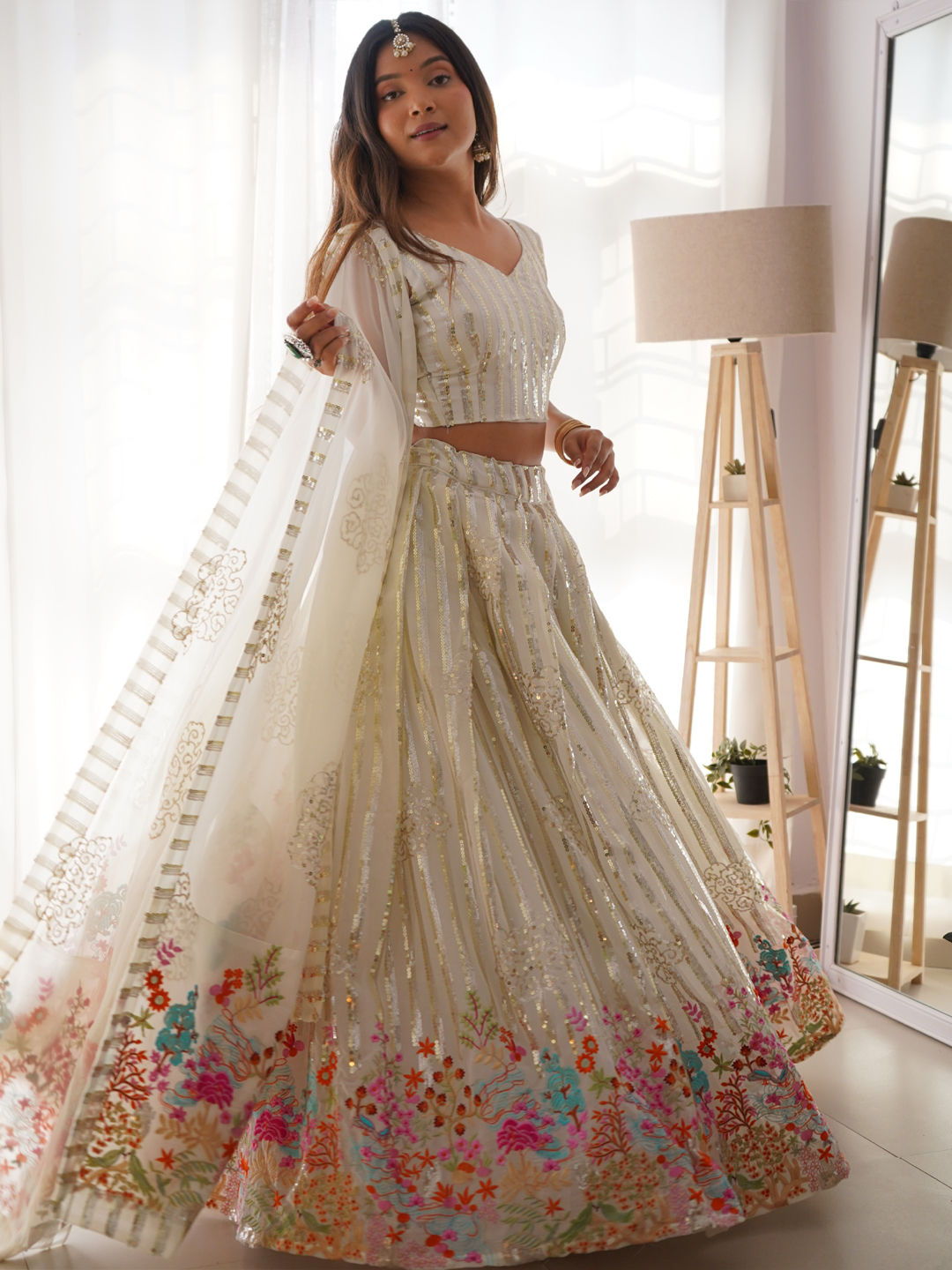 White and Off White color Lehenga in Faux Georgette fabric with Embroidered, Sequence, Thread work