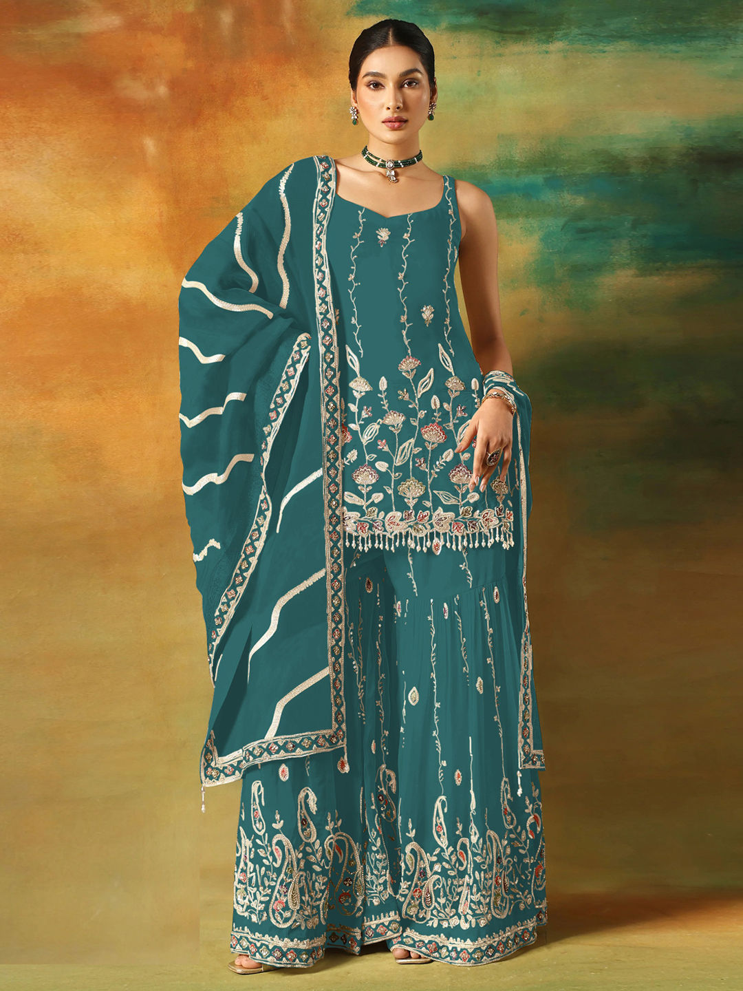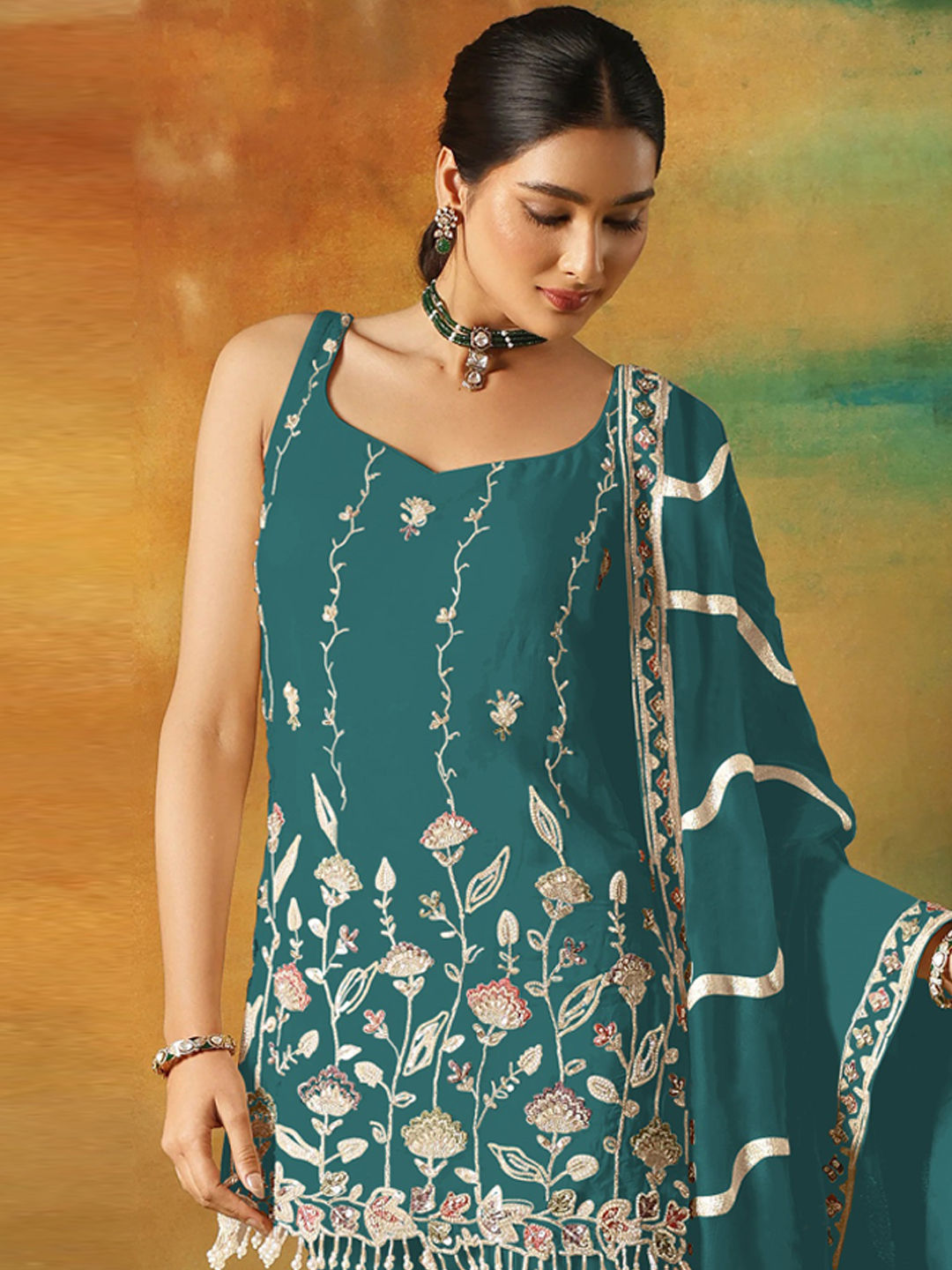 Blue color Salwar Kameez in Faux Georgette fabric with Bugle Beads, Sequence, Thread work