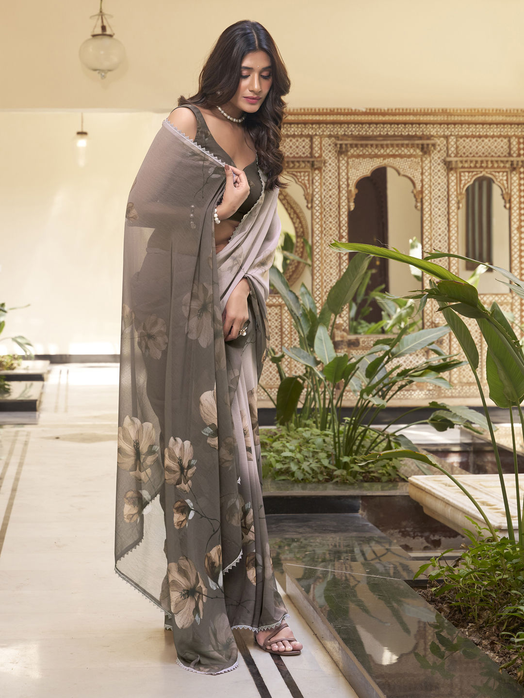 Beige and Brown, Green color Saree in Faux Georgette fabric with Floral, Lace, Printed work