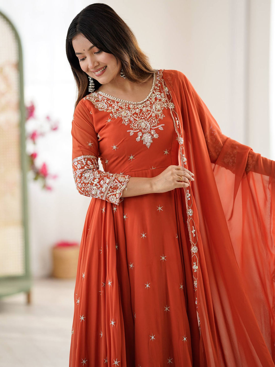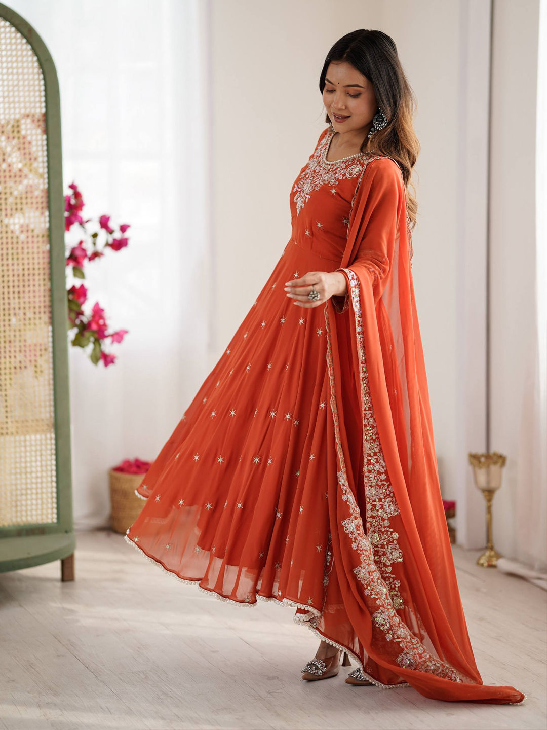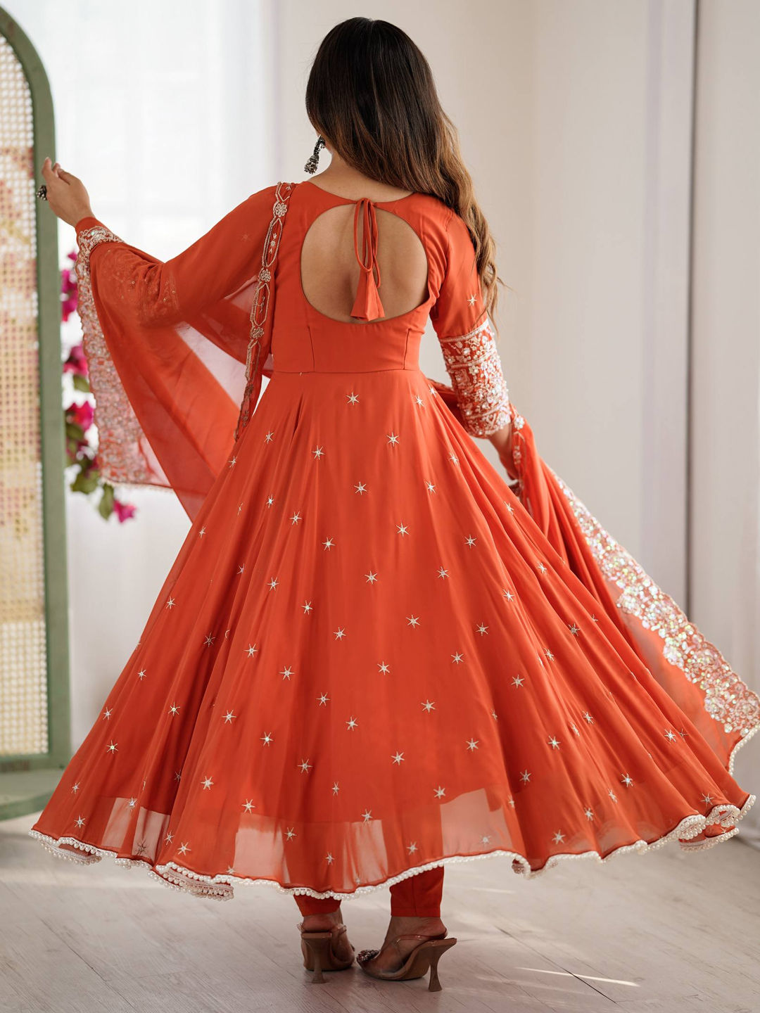 Orange color Salwar Kameez in Faux Georgette fabric with Embroidered, Moti, Sequence, Thread work