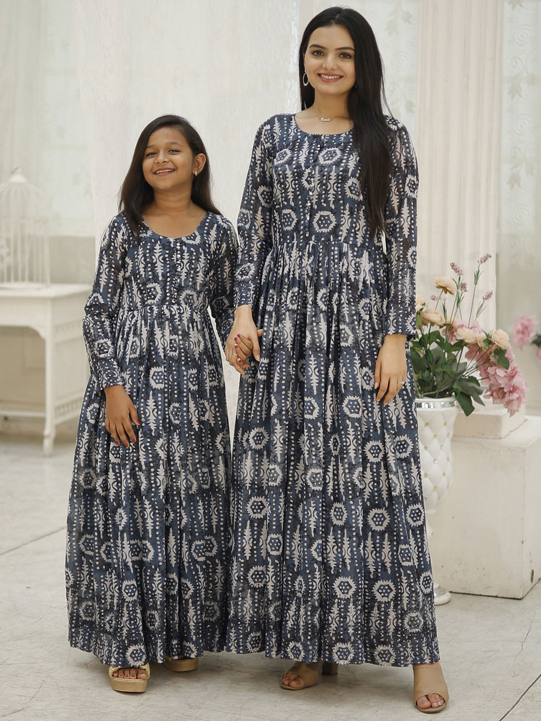 Black and Grey color Girls Gown in Faux Georgette fabric with Printed work