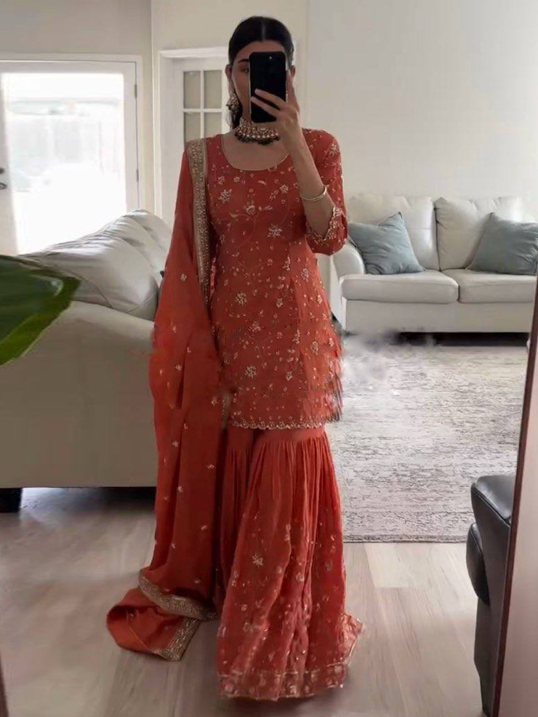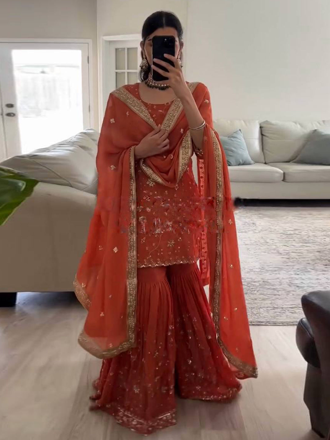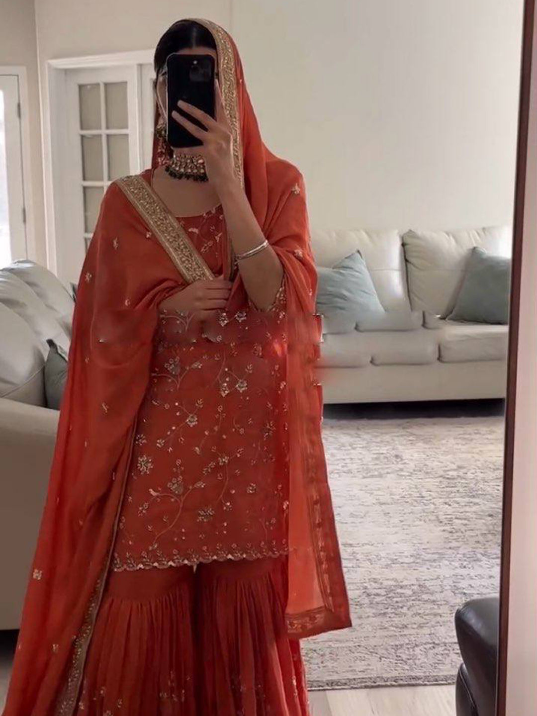 Faux Georgette Reception Salwar Kameez in Red and Maroon with Thread work