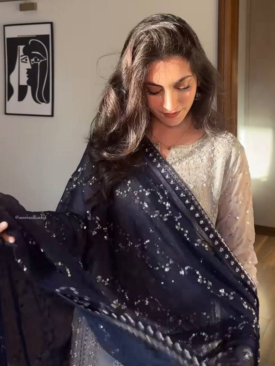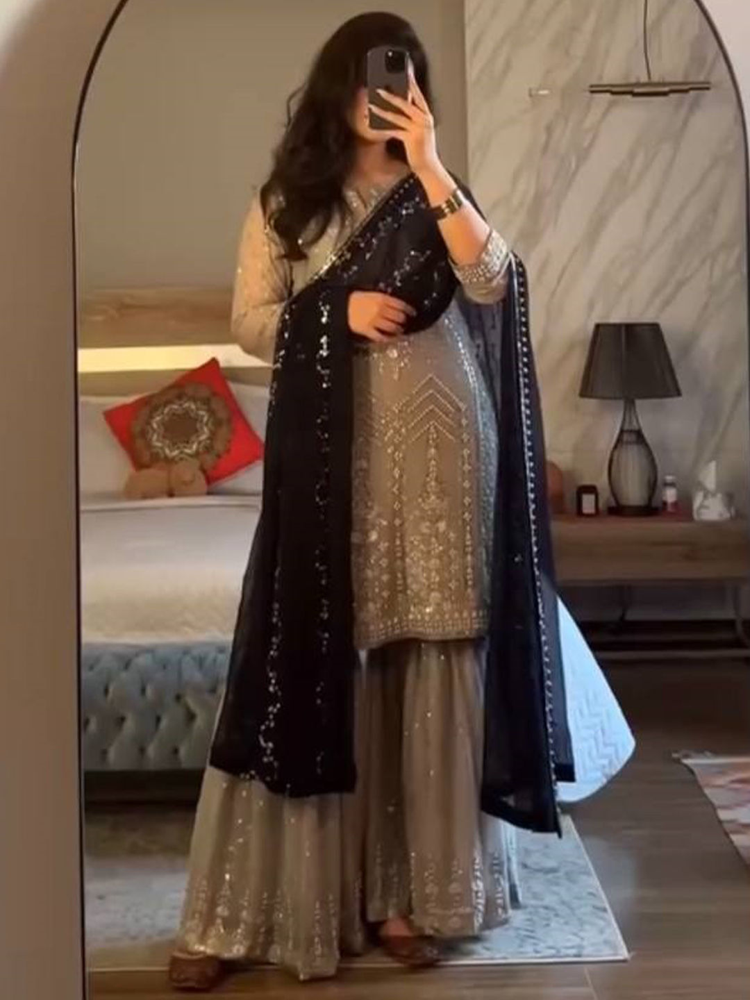 Black and Grey color Salwar Kameez in Faux Georgette fabric with Embroidered, Sequence, Thread work