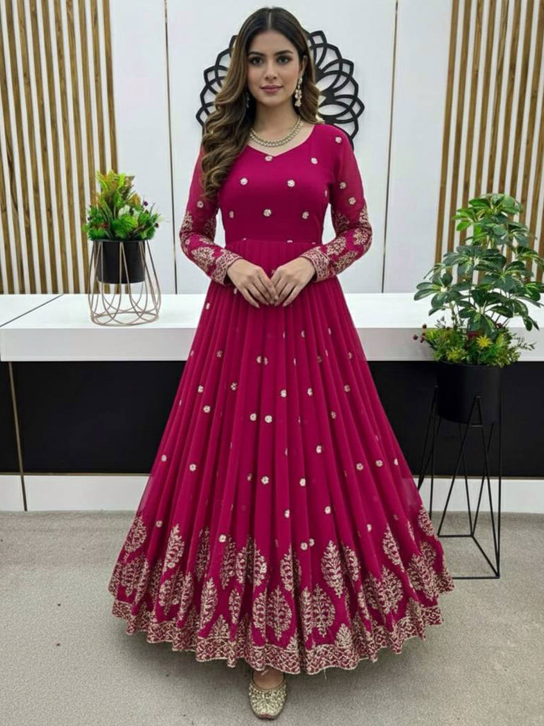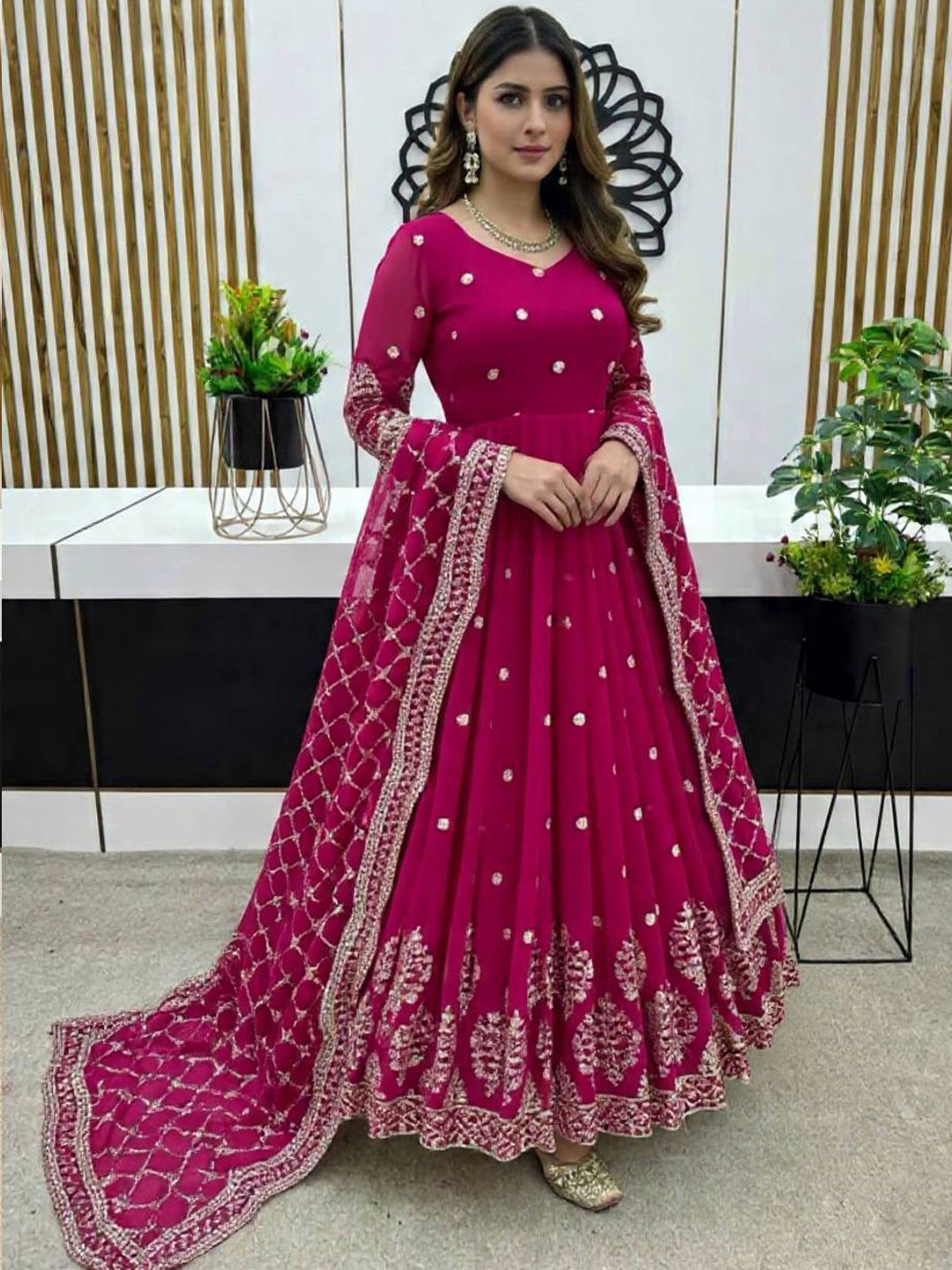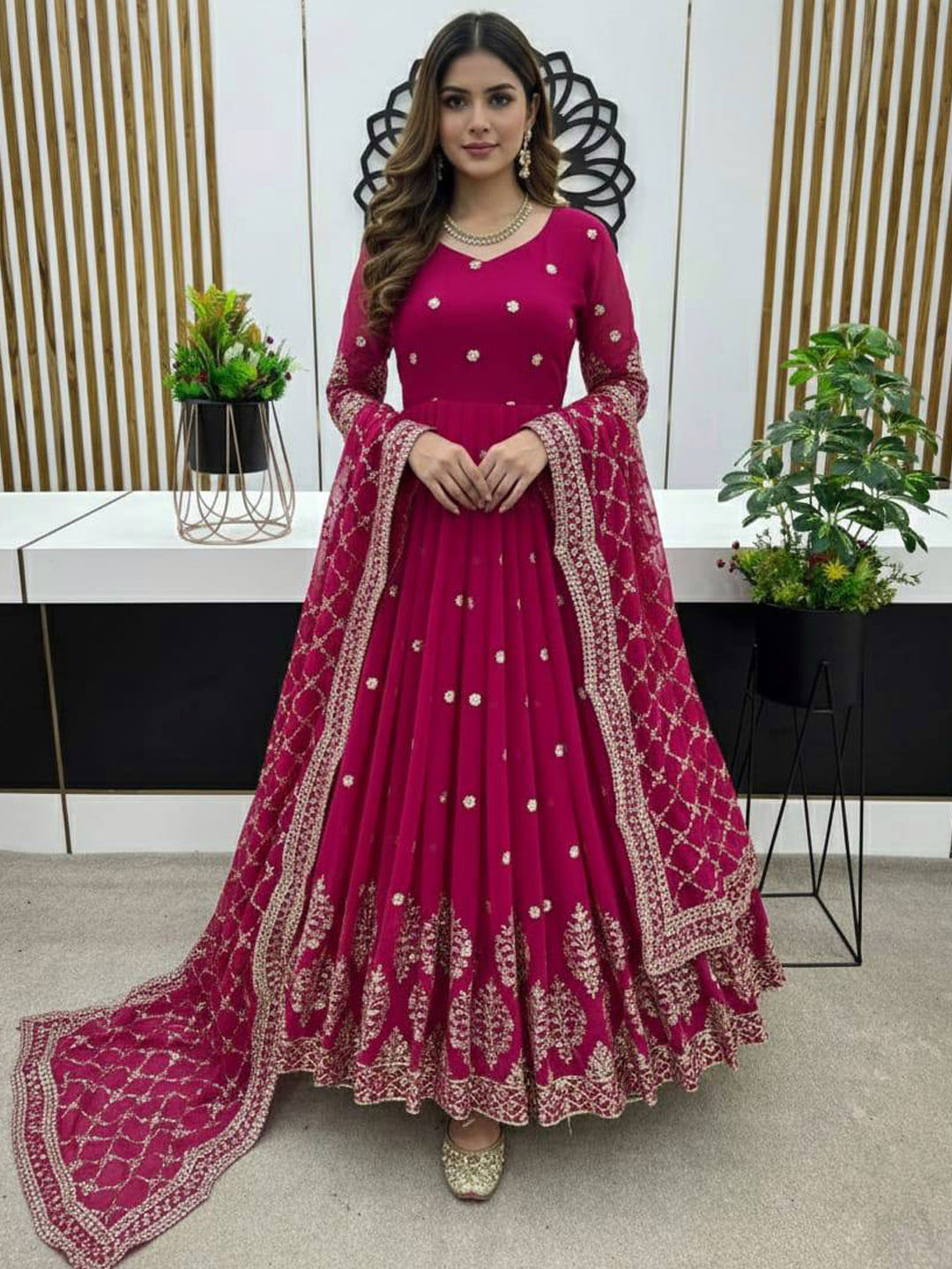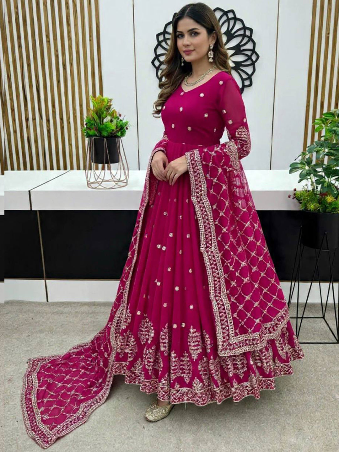 Pink and Majenta color Gown in Faux Georgette fabric with Embroidered, Thread, Zari work