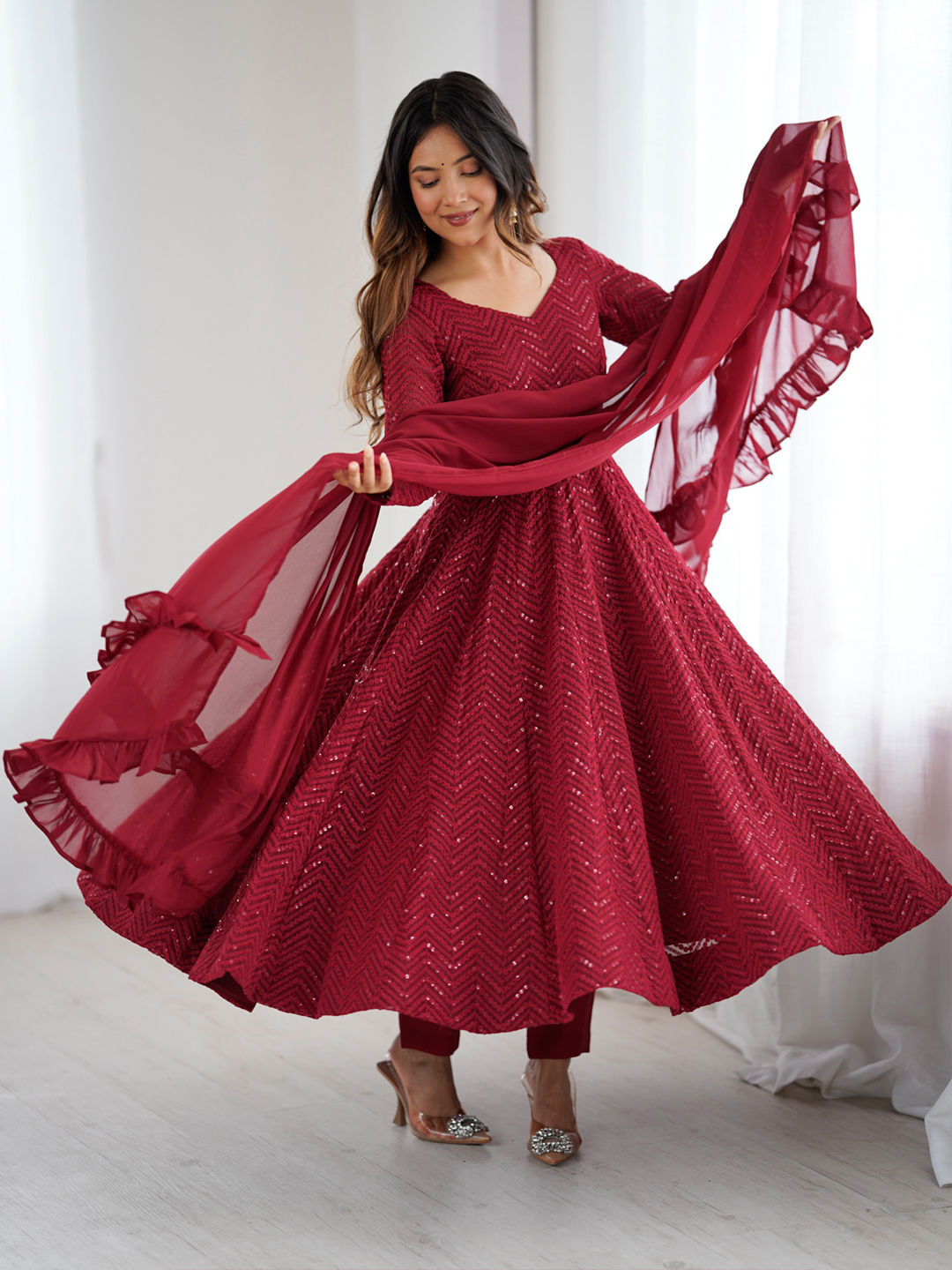 Red and Maroon color Gown in Faux Georgette fabric with Embroidered, Sequence, Thread work