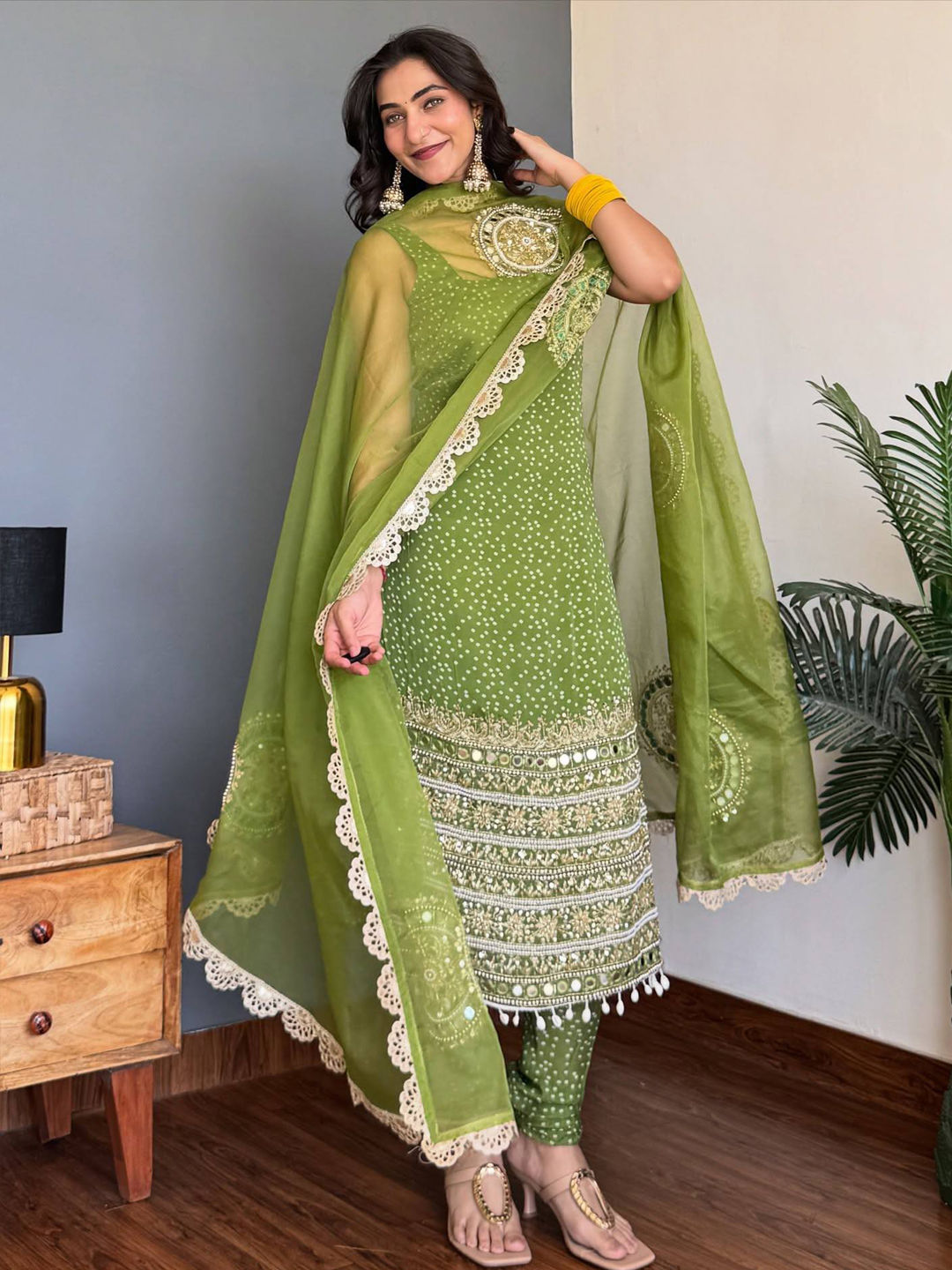 Green color Salwar Kameez in Faux Georgette fabric with Bandhej, Printed, Sequence work