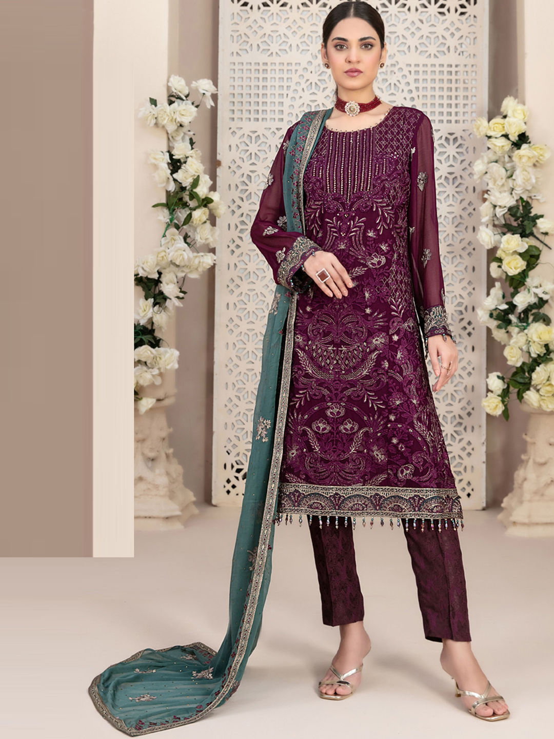 in Pink and Majenta with Embroidered work