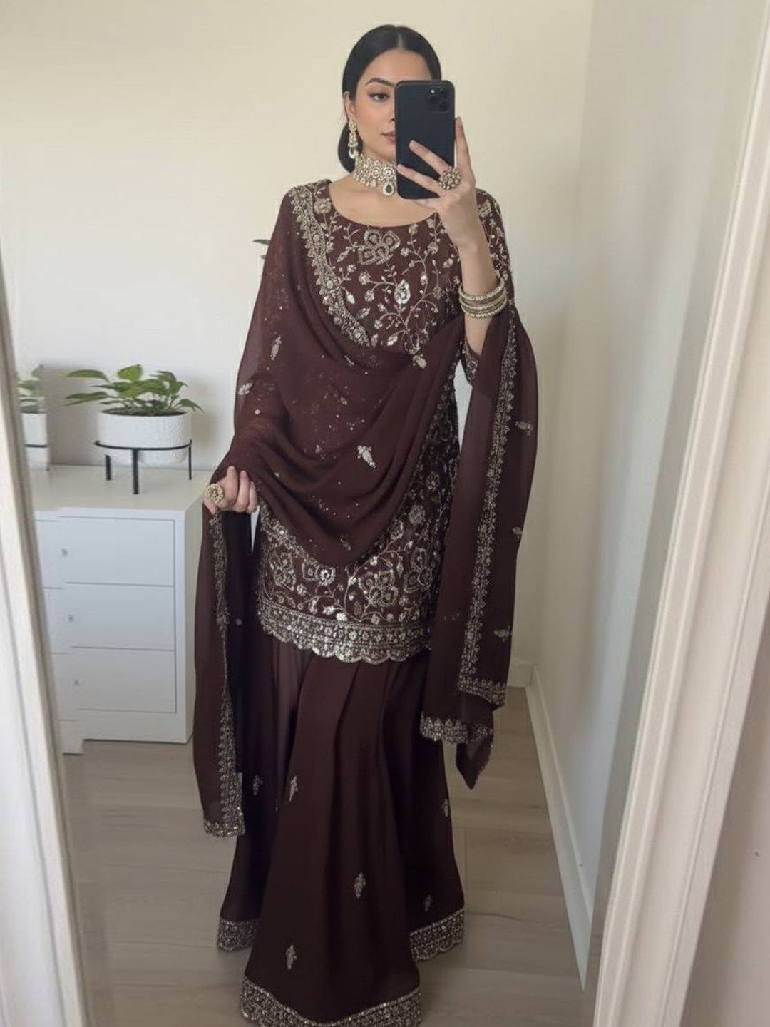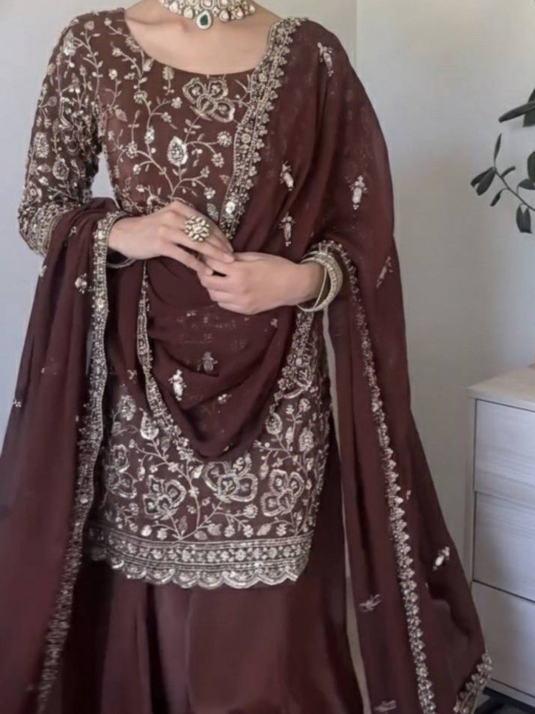 Faux Georgette Party Wear Salwar Kameez in Beige and Brown with Thread work