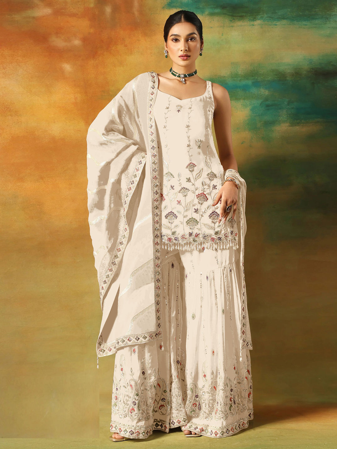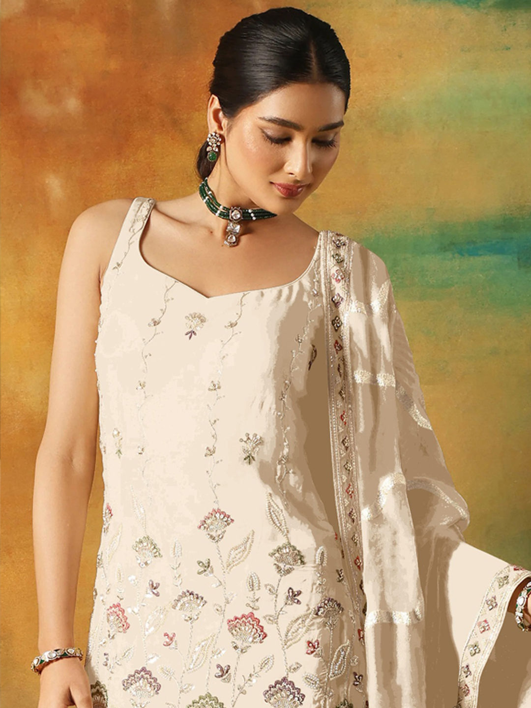 White and Off White color Salwar Kameez in Faux Georgette fabric with Bugle Beads, Sequence, Thread work