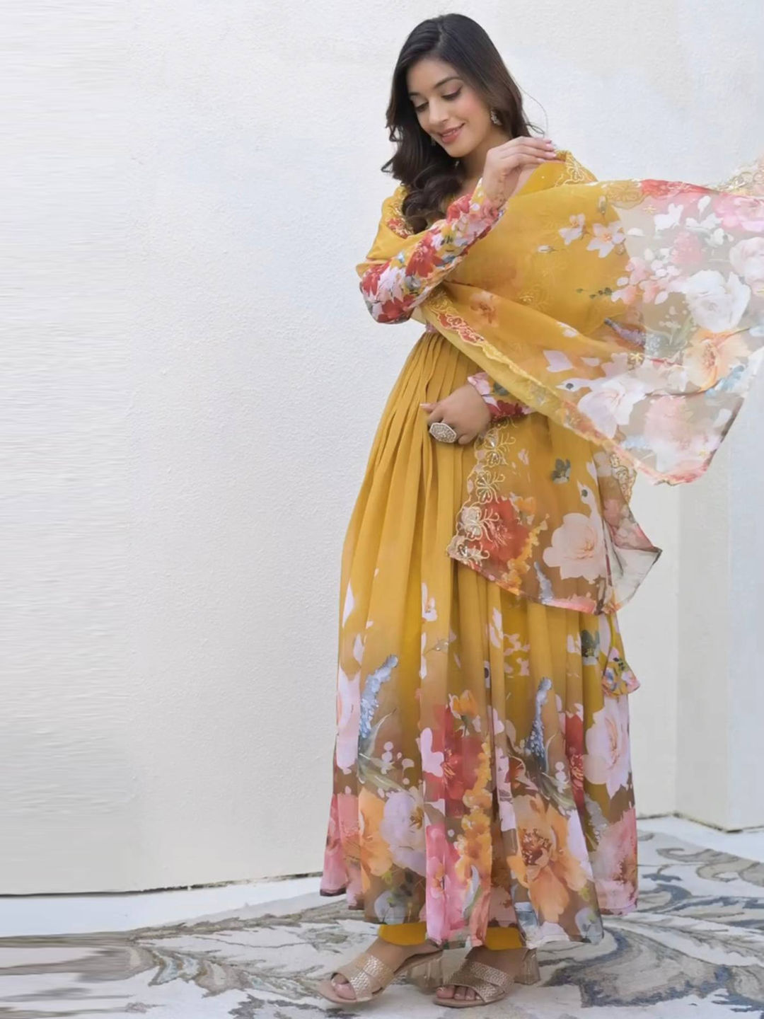 Yellow color Salwar Kameez in Faux Georgette fabric with Digital Print, Embroidered, Floral, Sequence work