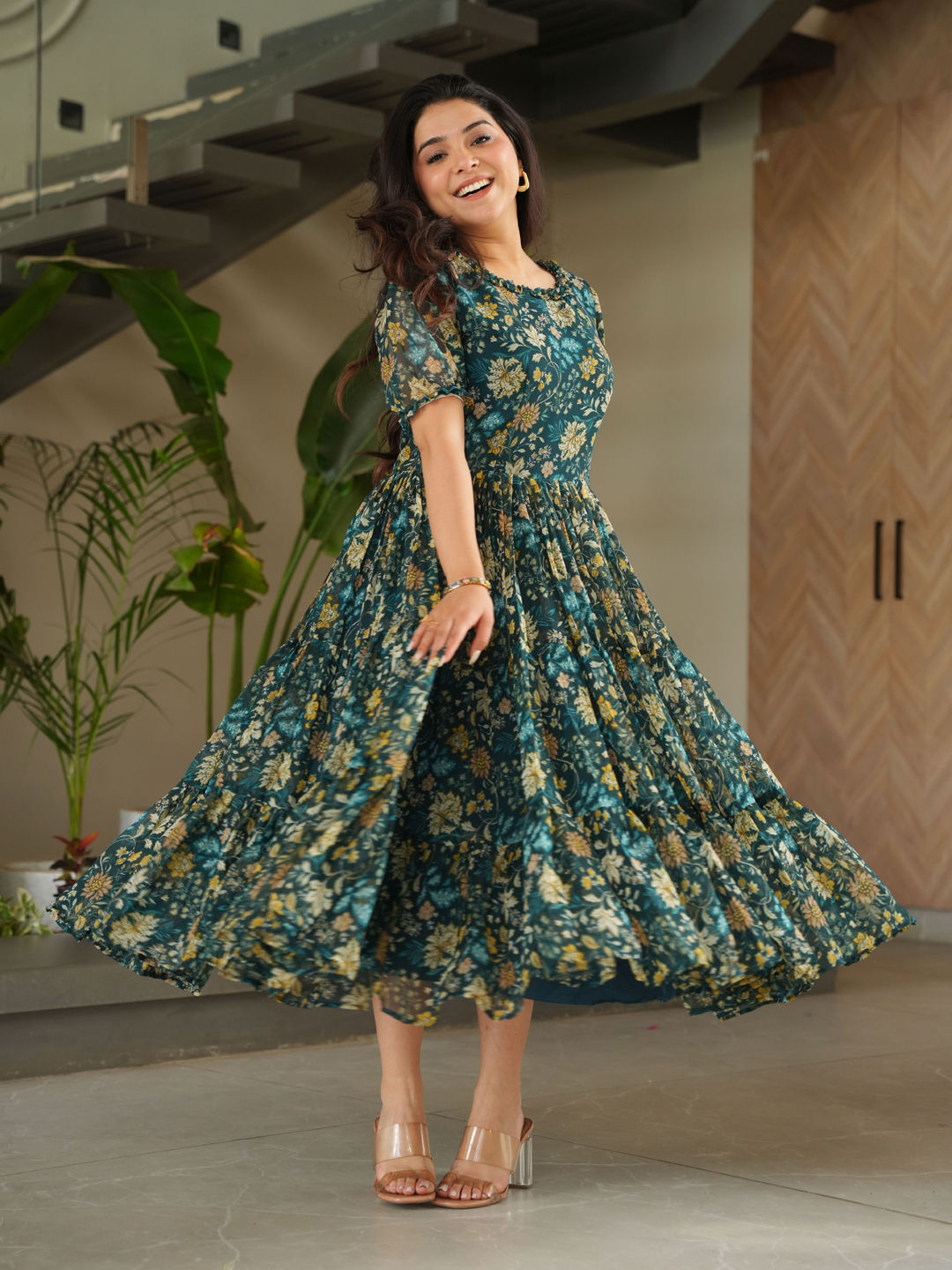 Blue color Dress in Faux Georgette fabric with Floral, Printed work