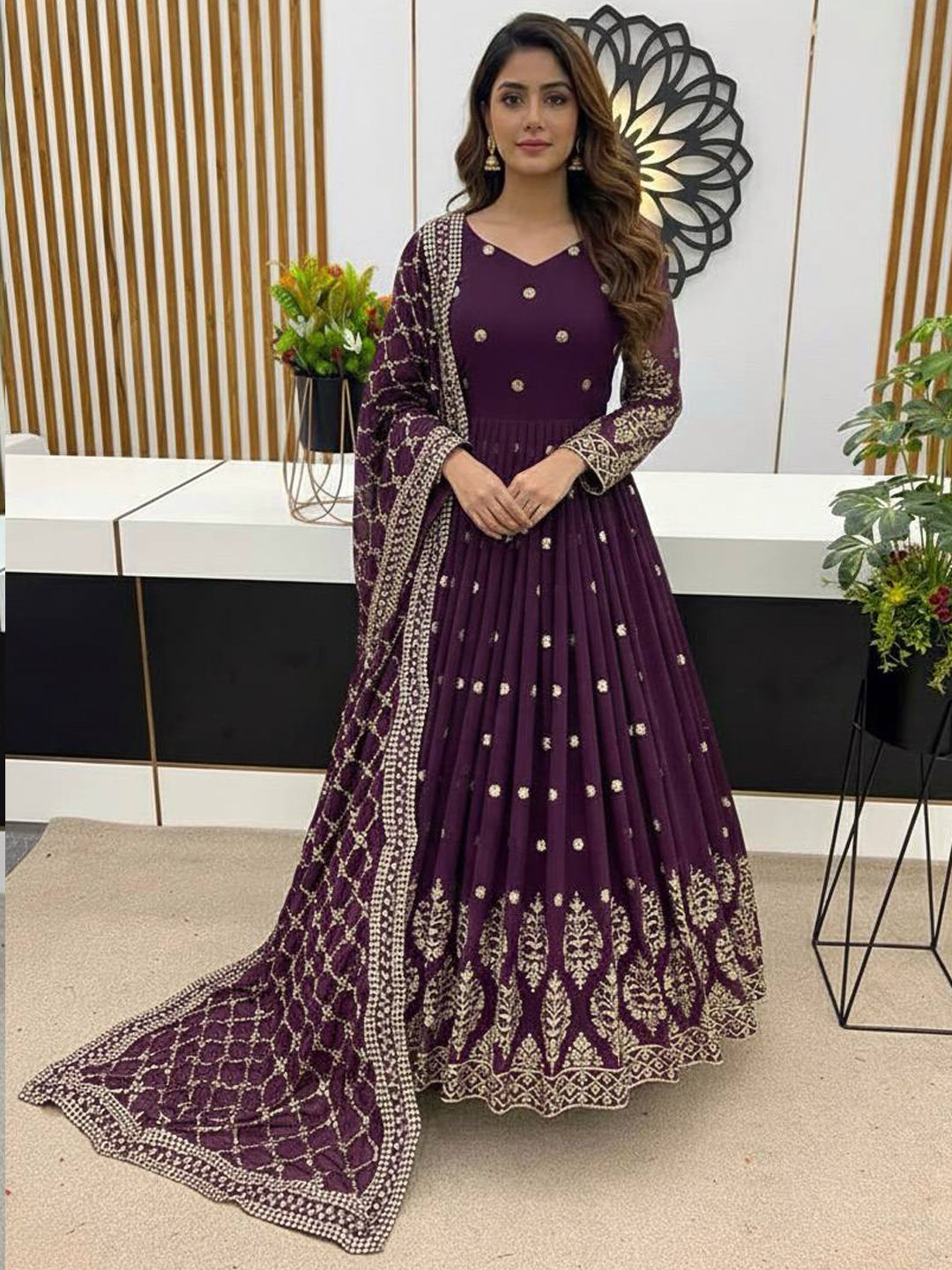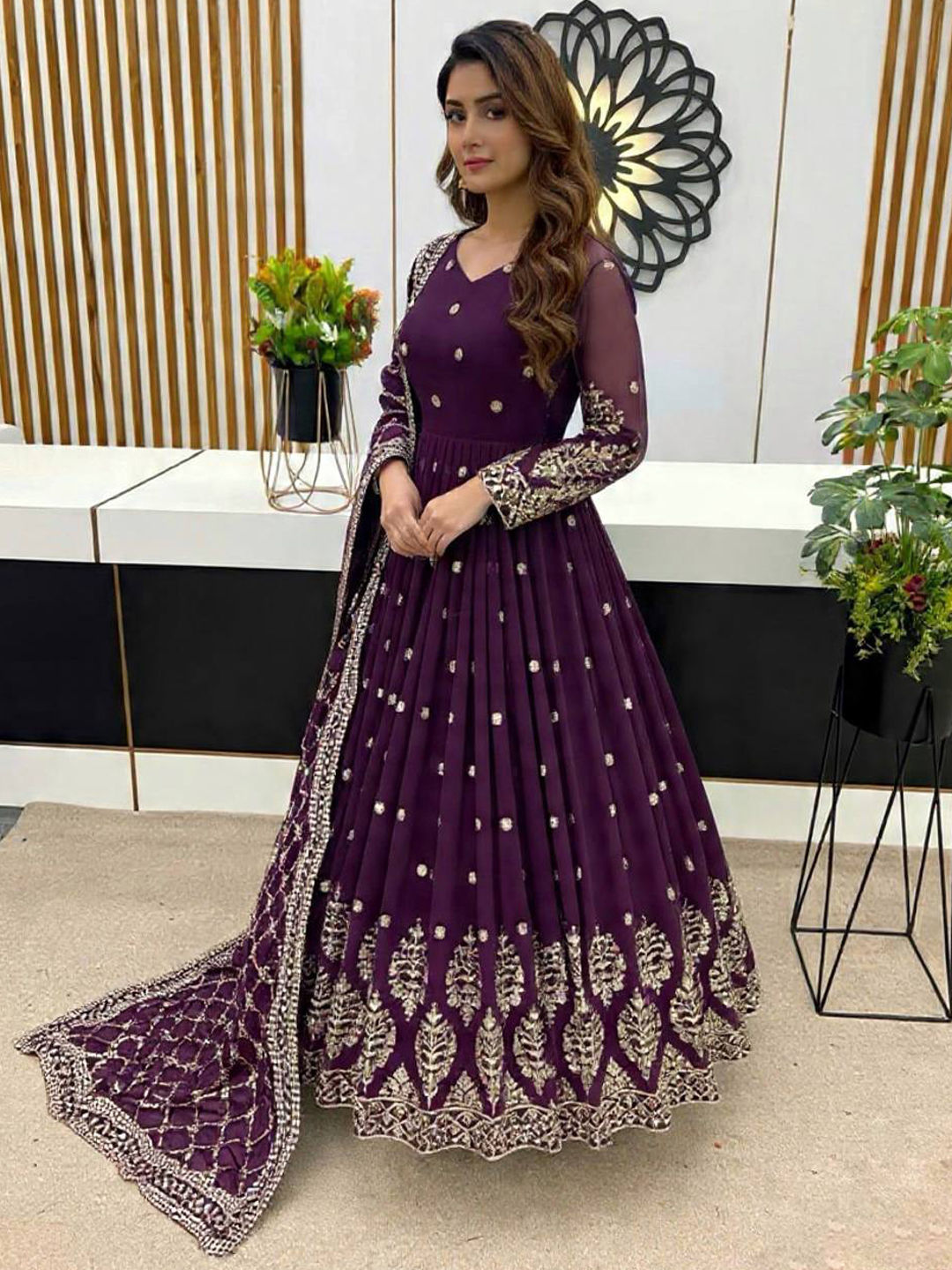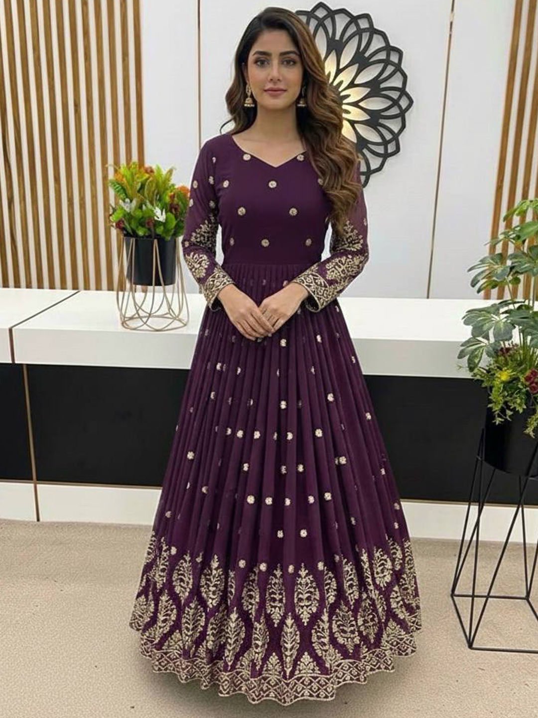 Purple and Violet color Gown in Faux Georgette fabric with Embroidered, Thread, Zari work