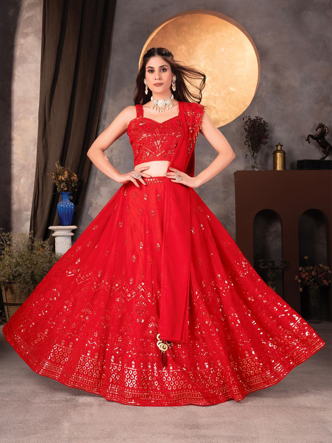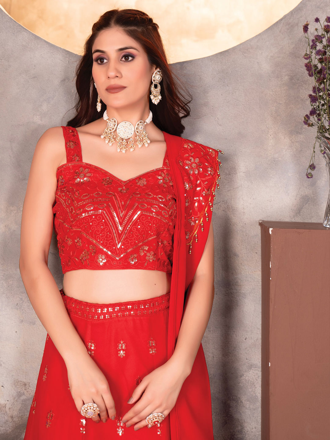 Red and Maroon color Lehenga in Faux Georgette fabric with Embroidered, Sequence, Thread work