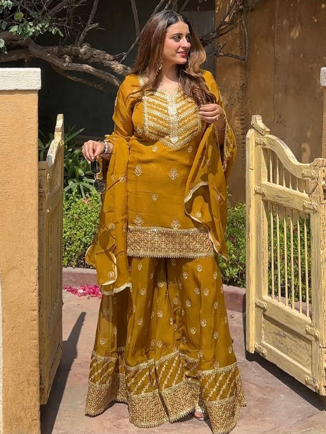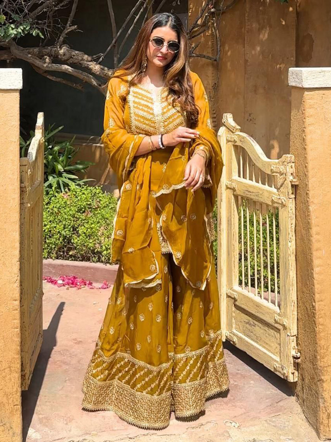 Yellow color Salwar Kameez in Faux Georgette fabric with Embroidered, Thread work