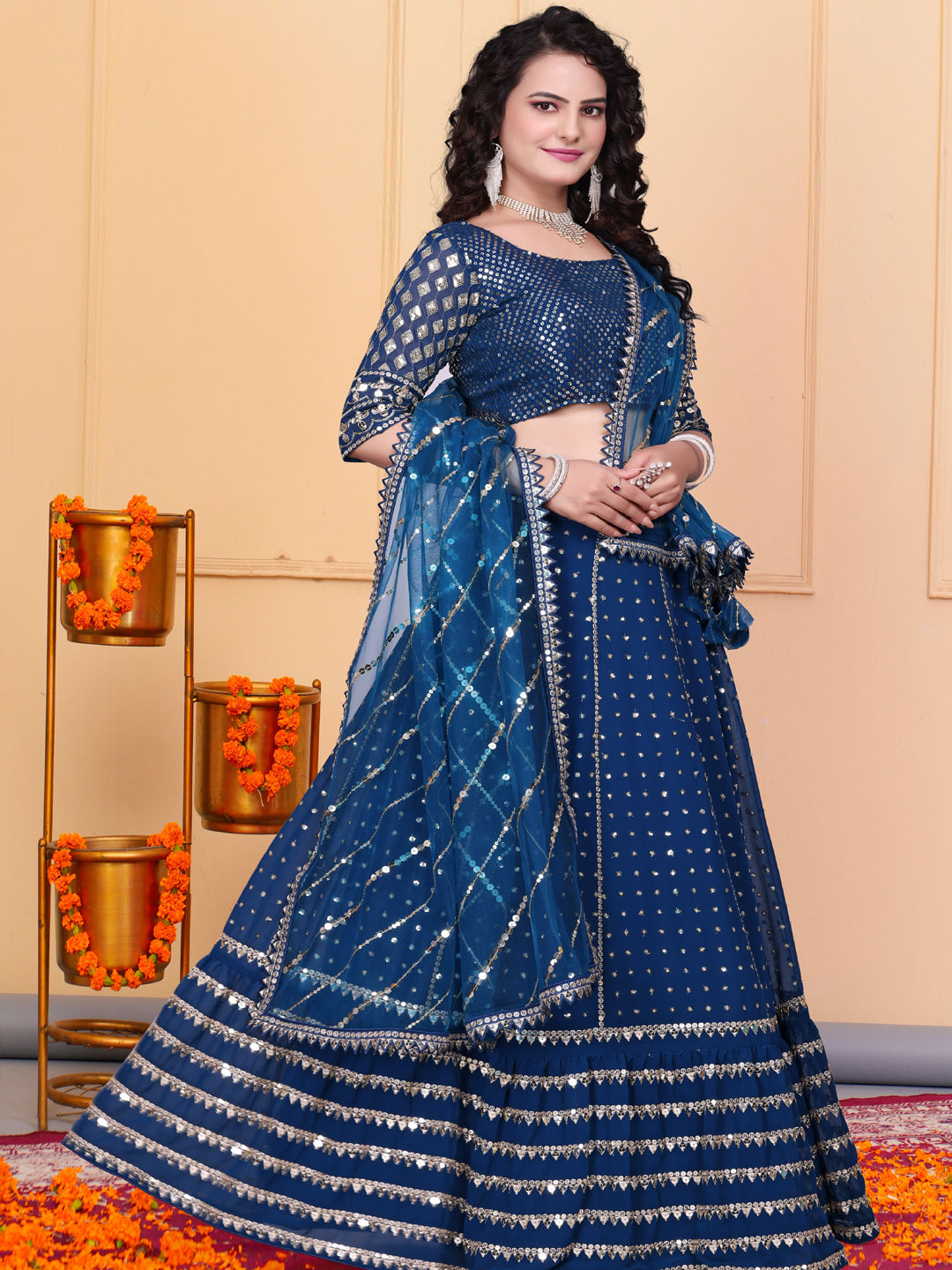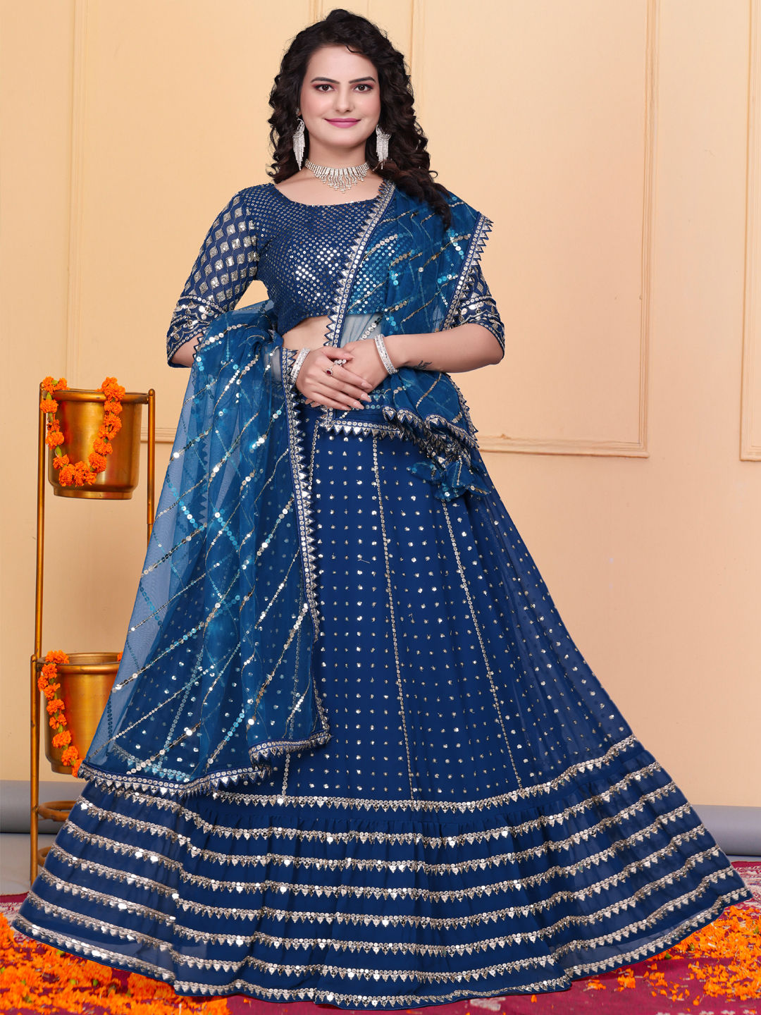 Blue color Lehenga in Georgette fabric with Sequence, Thread, Zari work