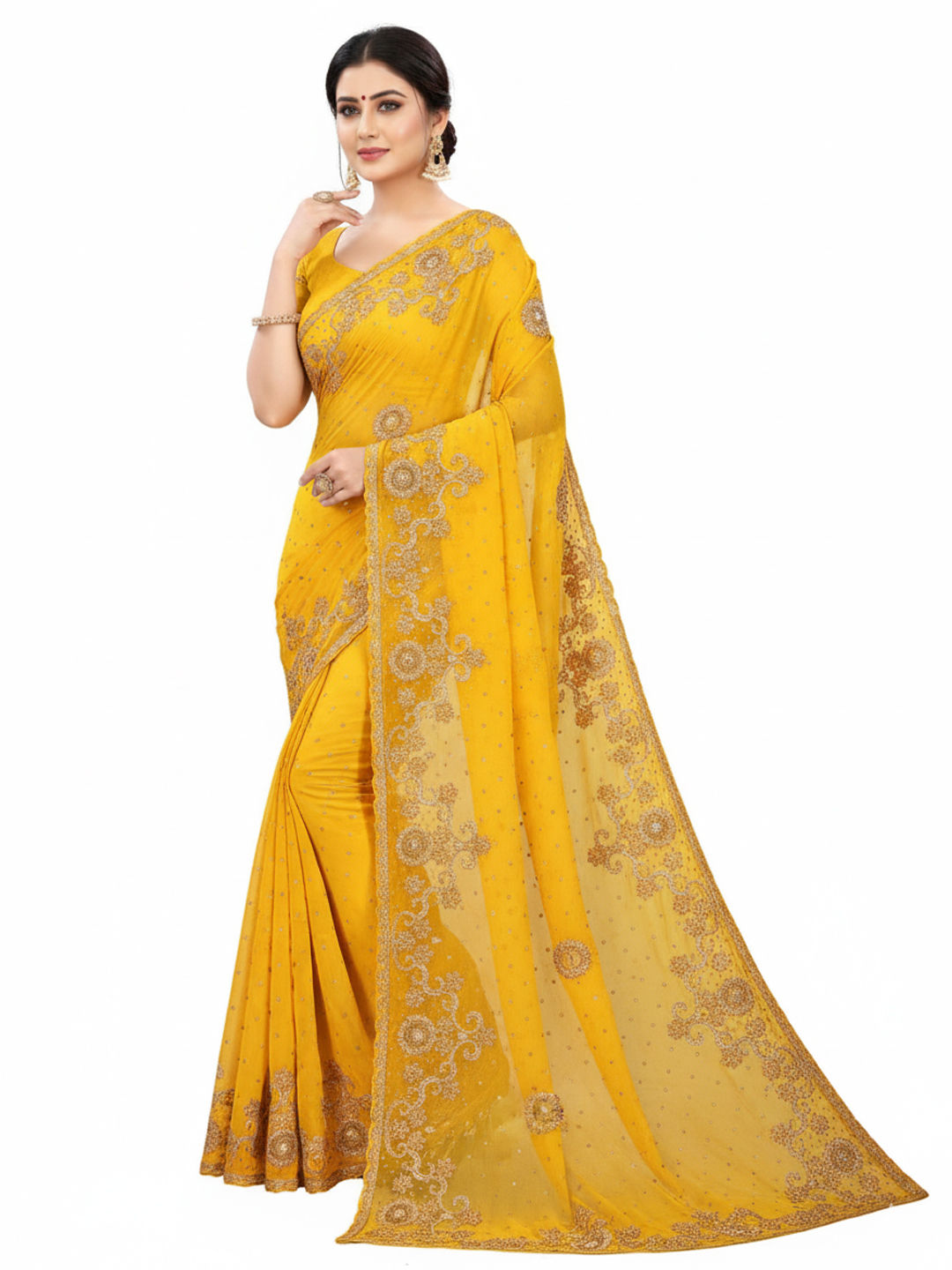 Yellow color Saree in Georgette fabric with Embroidered, Stone work