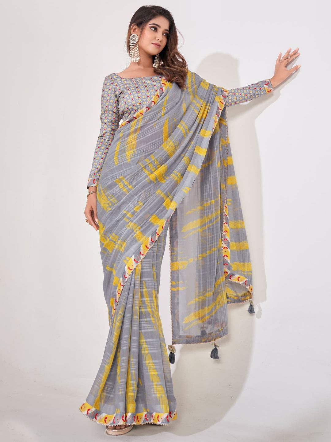 Black and Grey color Saree in Georgette fabric with Lace, Printed work