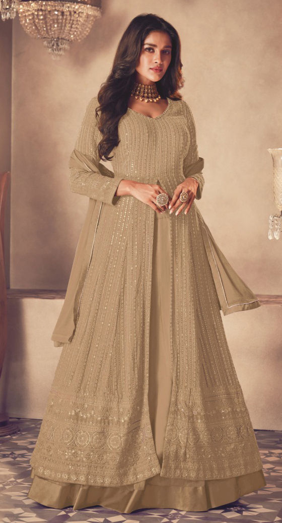 Beige and Brown color Long Lehenga Choli in Georgette fabric with Embroidered, Resham, Sequence, Thread work