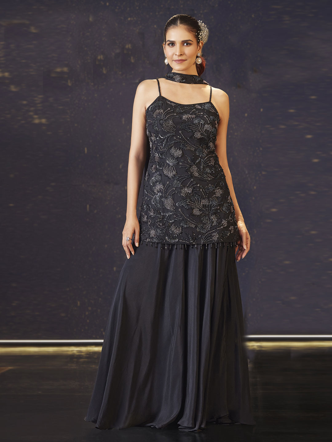 Black and Grey color Salwar Kameez in Georgette fabric with Bugle Beads, Sequence work