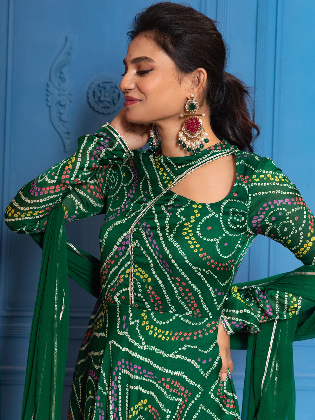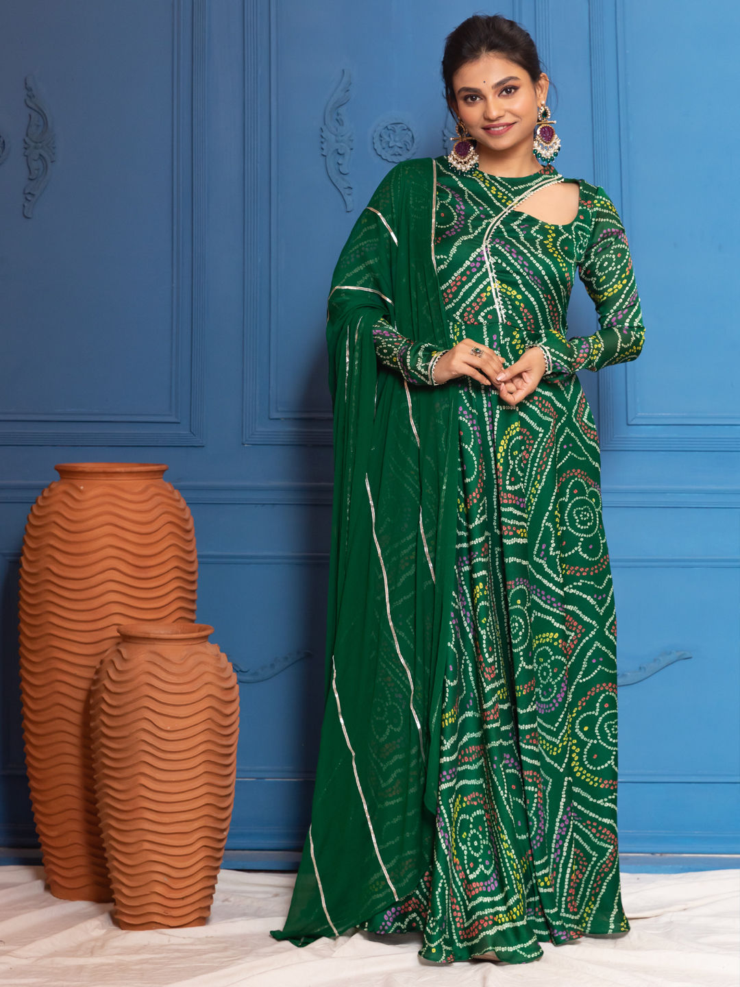 Green color Gown in Georgette fabric with Bandhej, Gota Patti work